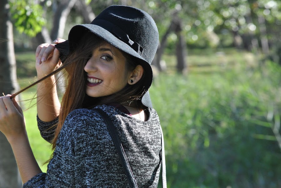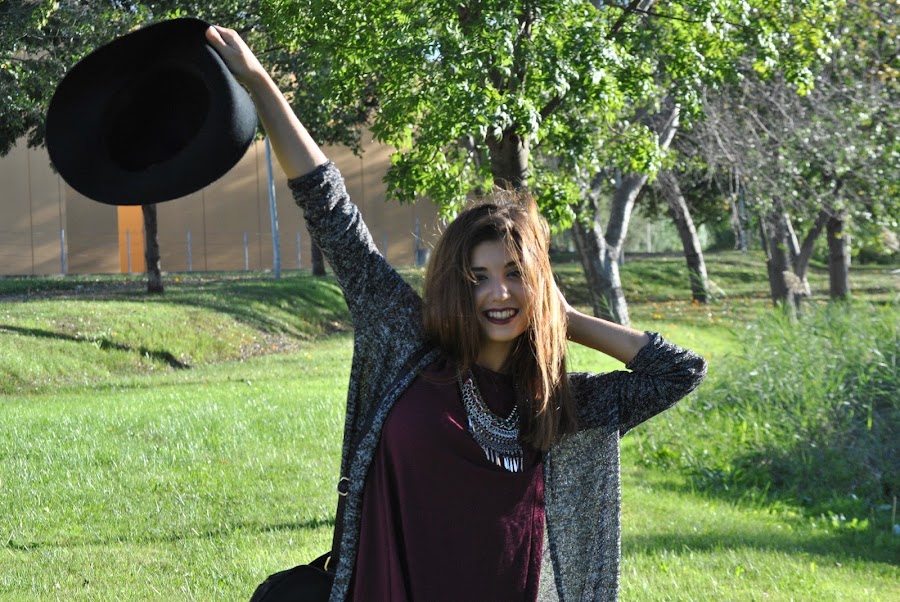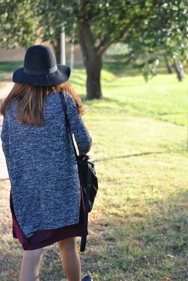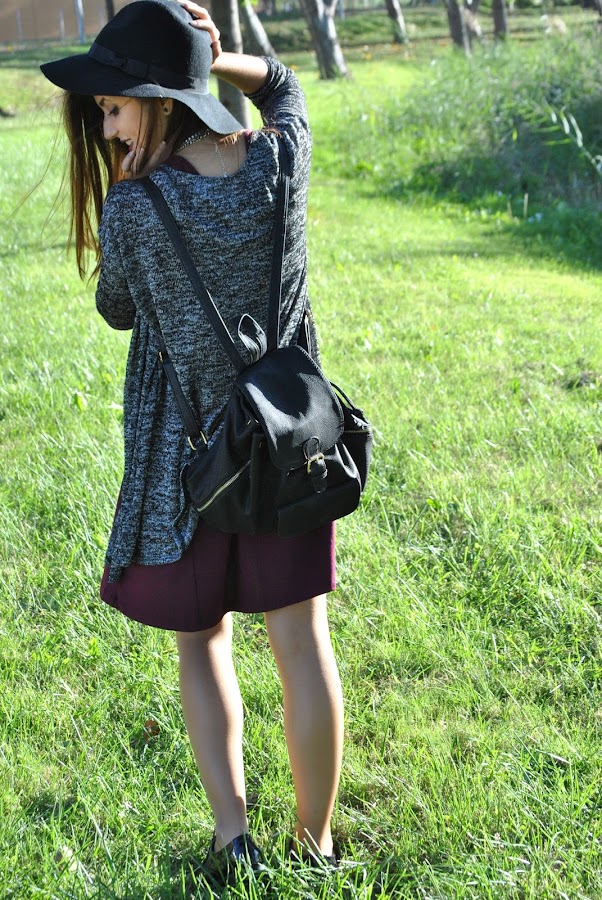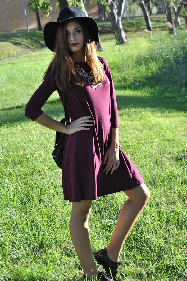 Para el outfit de hoy llevo un vestido tipo camiseta de color borgoña, el cuál supe en el momento en el que lo vi con qué quería llevarlo. Cárdigan negro mezclado, fedoranegra, oxfords negros, mochila negra. Ninguna duda. Y a los minutos... vi el collar y supe que ya tenía el toque final. ¡Todo perfecto! Solo hacía falta probarlo y hacer fotos...
