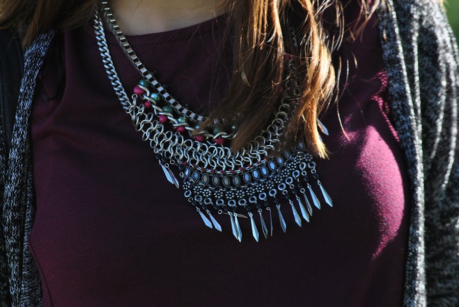 On this outfit I am wearing a burgundy dress with black cardigan, black fedora, black bag and black oxford shoes. When I saw this dress I knew I had to wear it with this. I also combined it with this gorgeous statement necklace.