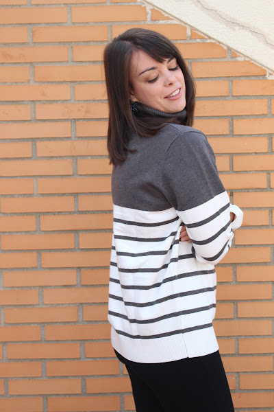 El primer outfit es uno muy sencillo, con pantalones ajustados elásticos, botines blancos y como protagonista, el jersey blanco con rayas y parte de arriba en gris. Es de muy buena calidad, muy suave y agradable al tacto, de cuello alto y de grosor medio. Para mi es perfecto porque cada vez soy más calurosa y prefiero llevar este tipo de jerseys, los gordotes me los pongo de forma muy puntual y para sitios que sé que va a hacer mucho frío, si no, me muero de calor.Este jersey me lo pongo con una camiseta de manga corta debajo y feliz de la vida (o con camiseta de manga larga si hiciera falta).