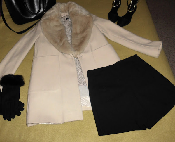 Jersey en color crudo con lentejuelas y pequeña abertura en la espalda, shorts negros de tiro alto, abrigo de paño en color rosa empolvado con cuello de pelo, shopper negro, guantes negros de ante con pelo y palas negras con cadena dorada.