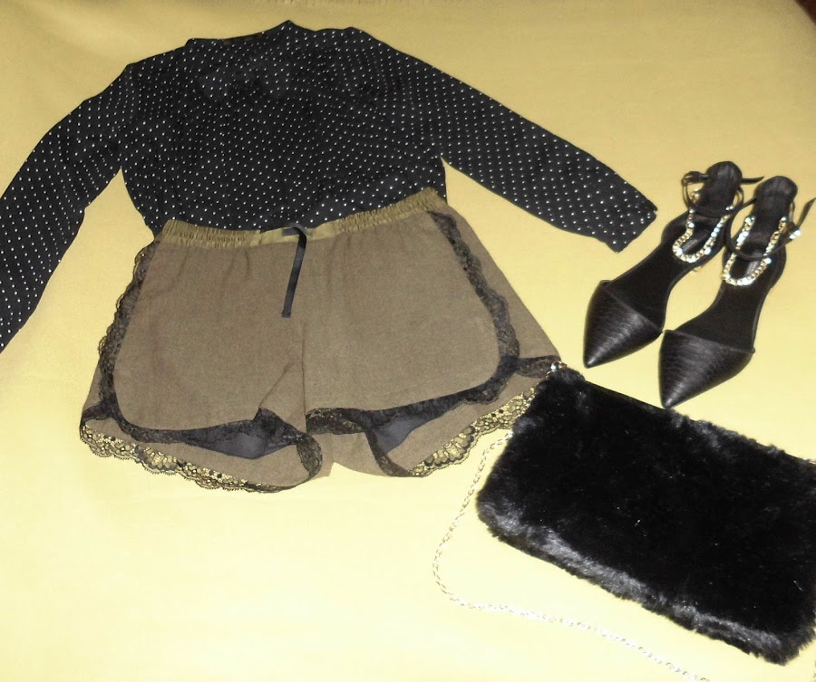 Blusa negra estampada con lunares blancos y lazada en el cuello, shorts caquis con encaje negro en los bordes, bolso de pelo y palas negras con cadena dorada.