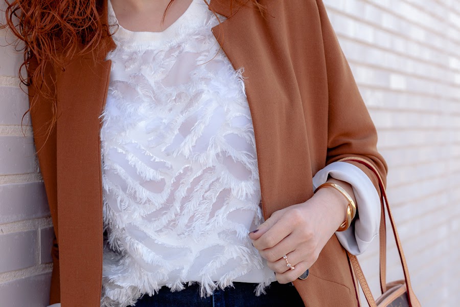 Blazer: Stradivarius. Top: Shein Jeans: Zara. Cinturón/Belt: Sweet Coquete. Pendientes/Earrings:Mango. Pulsera/Bracelet: Sfera. Anillo/Ring: Soufeel. Zapatos/Heels:Zara. Bolso/Bag: Louis Vuitton.