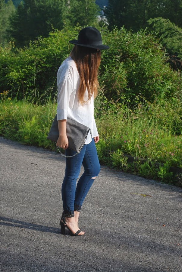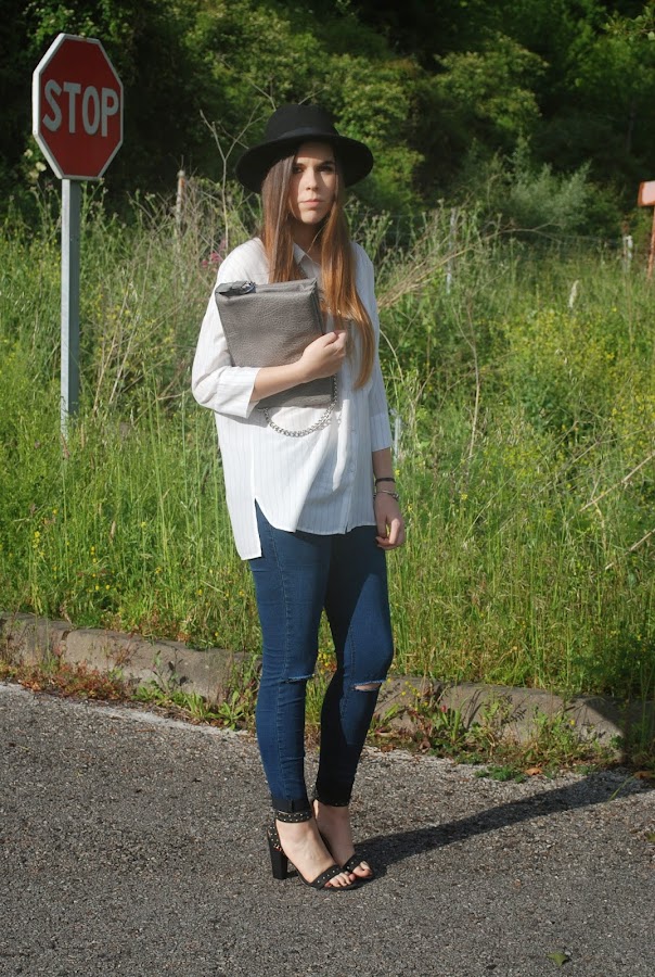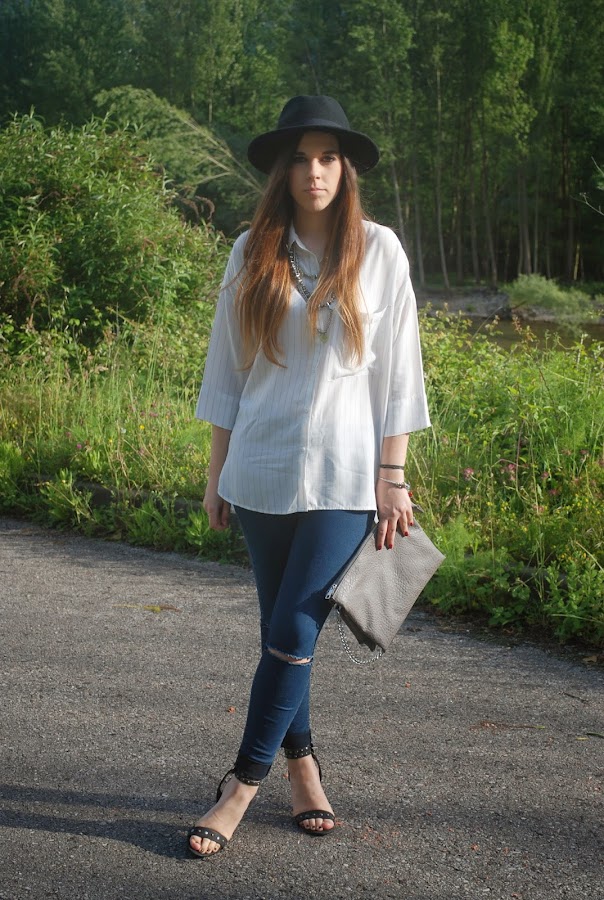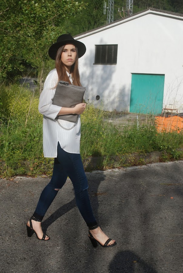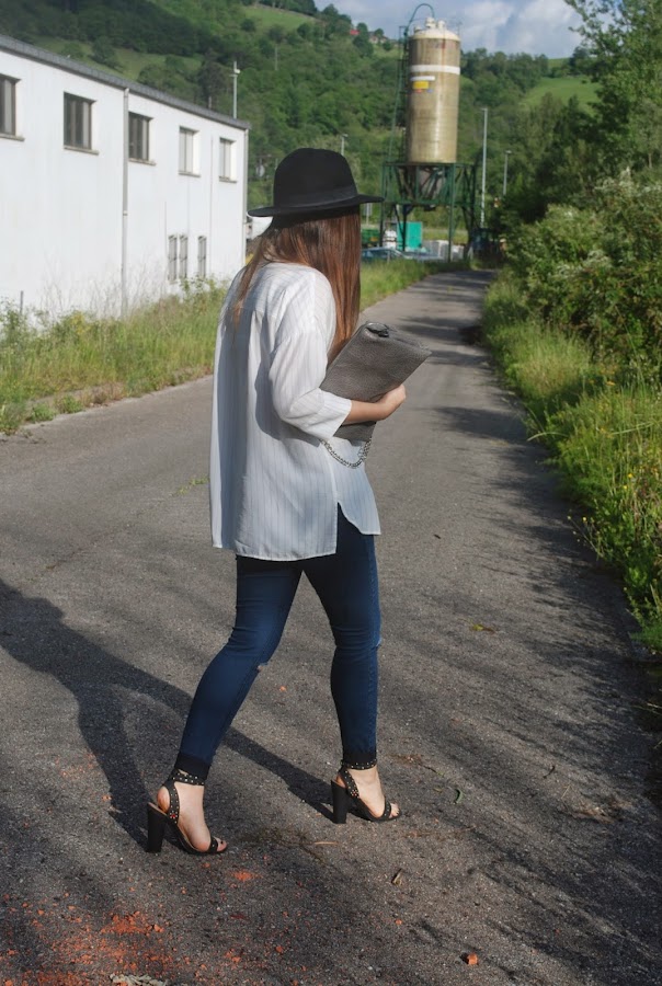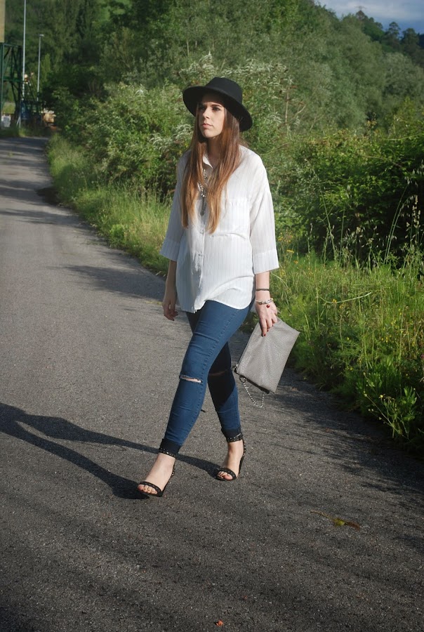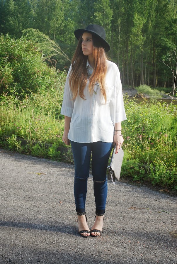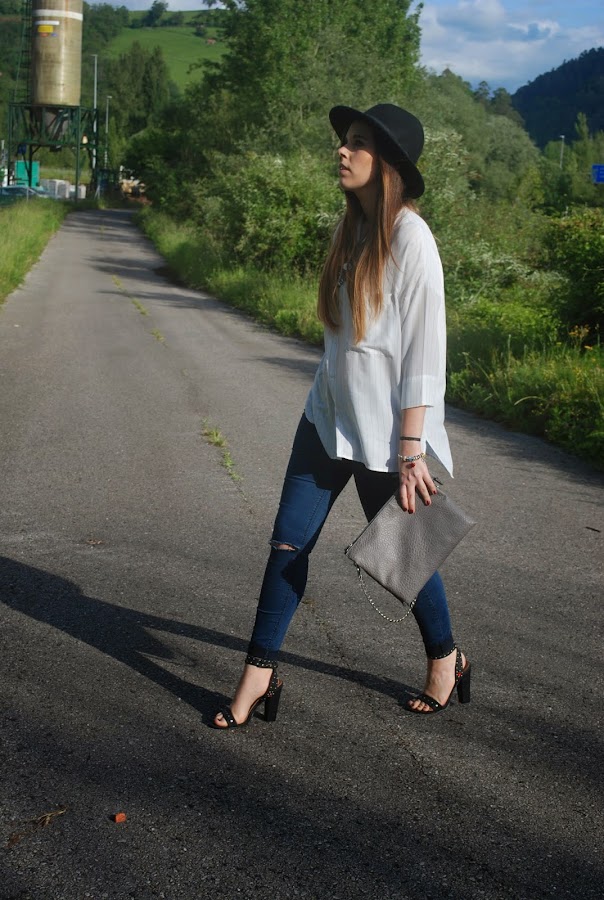 Para acompañarlas ripped jeans y maxi camisa (es de mis camisas favoritas, pero llevarla sola implica que parezca que pesas 10kg mas...). Como complementos collar, sombrero, pulsera con charms y mi nuevo clutch, regalo que me enviaron desde MaryPaz por mi cumpleaños.