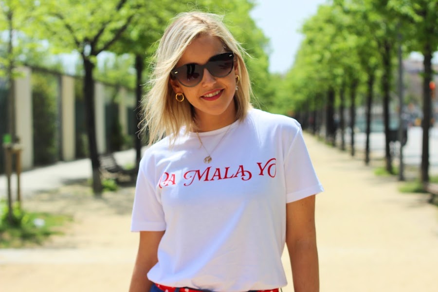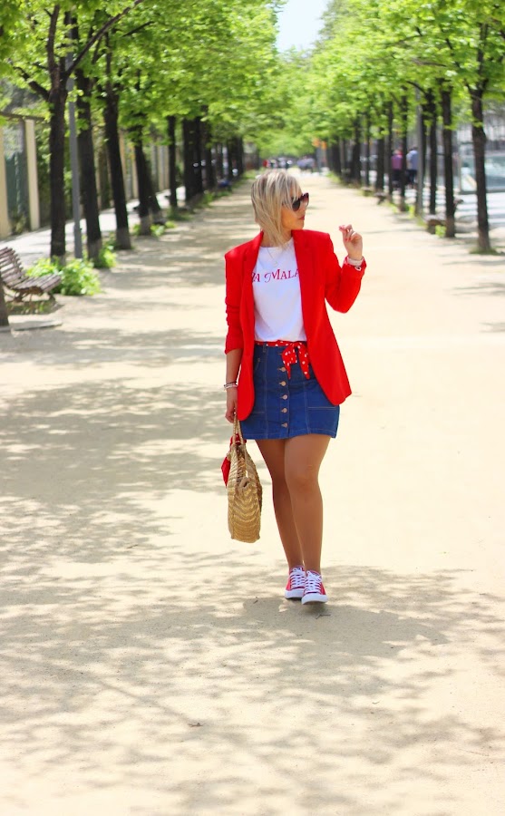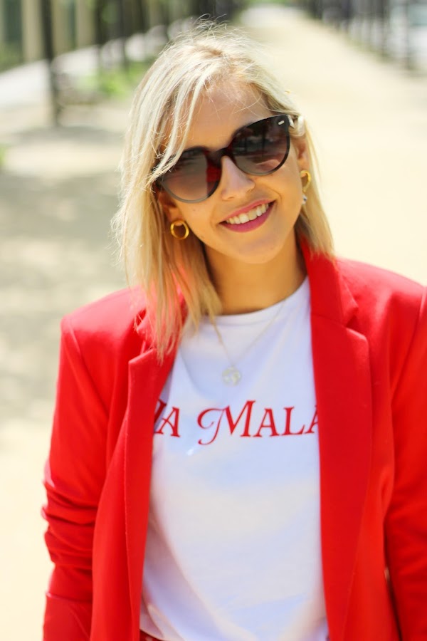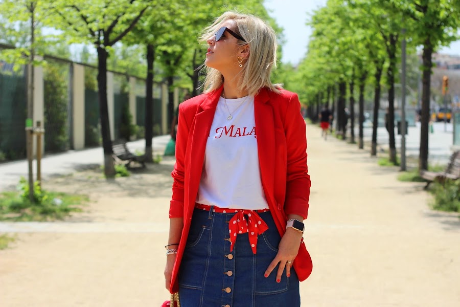 Hoy os traigo un look que me encanta y creo que me podría todos los días. En el look de hoy llevo mi nueva camiseta de Stradivarius con el título de una de mis canciones favoritas "Pa mala yo" de Aitana y Ana Guerra. La he combinado con una falda tejana y una americana roja. El resto de accesorios, fueron mis nuevas Converse rojas, mi bolso redondo de rafia y mis nuevas gafas de Nomo que es una nueva marca de gafas de sol que tienen unos modelos geniales.