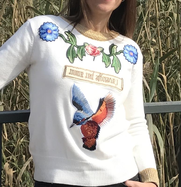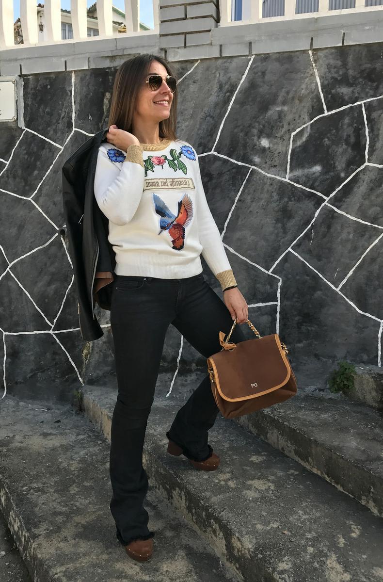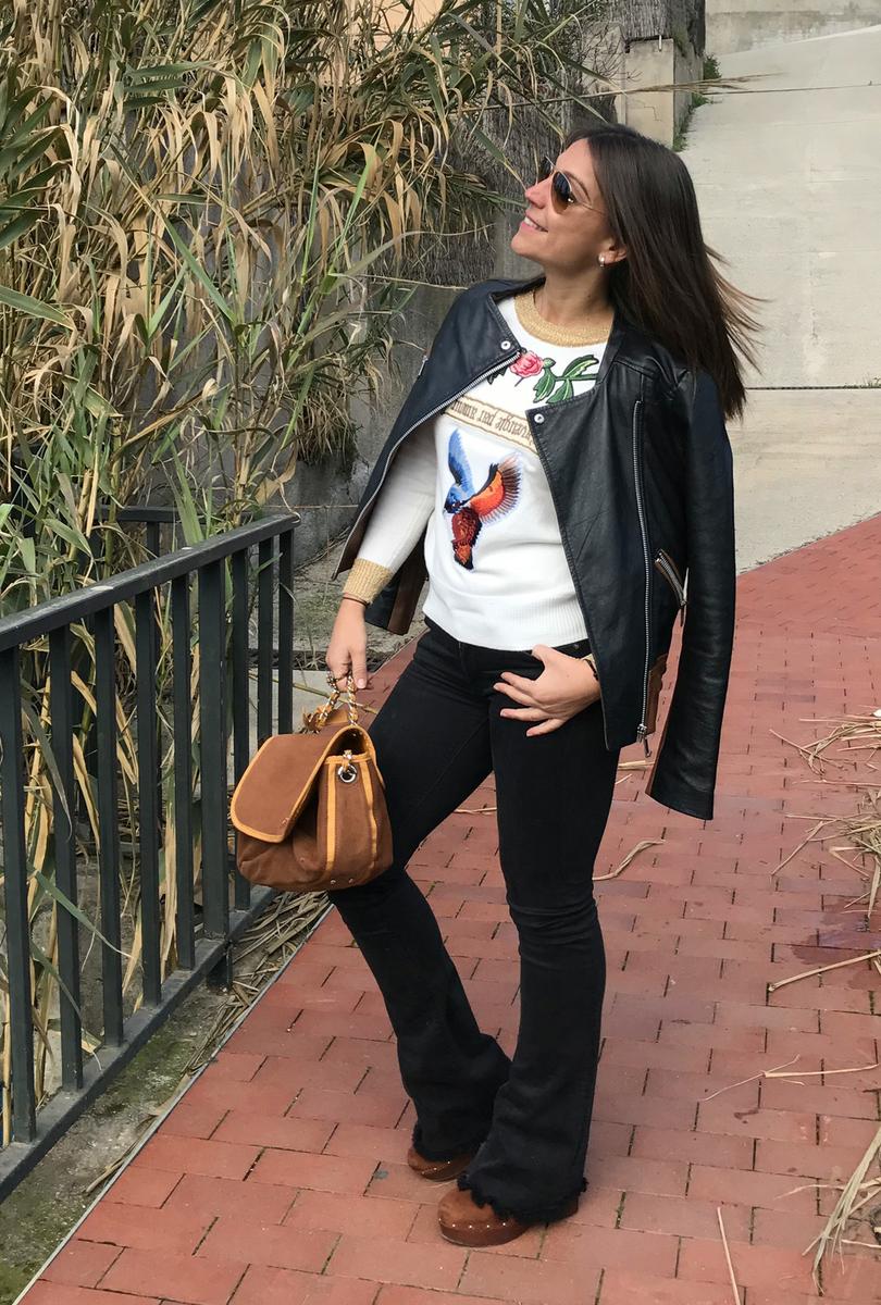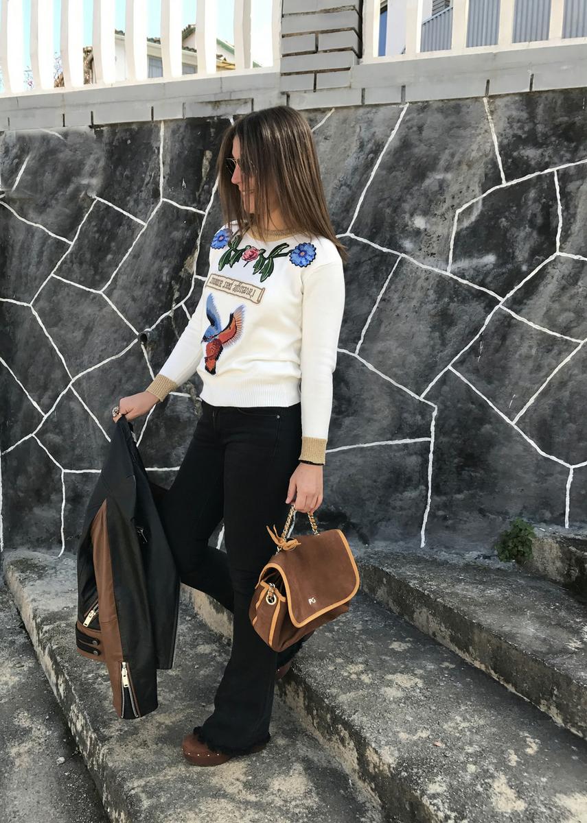 Para mi look de hoy he apostado por una biker de cuero en dos colores y así obtener un estilo un poco más atrevido, aunque el conjunto no se sale de lo normal, por eso la guinda del conjunto la pone el jersey. Un jersey de ROMWE precioso, con una suave lana blanca, puños y cuello en dorado y como no, adornado con bordados de flores y un gran pájaro en la parte delantera.