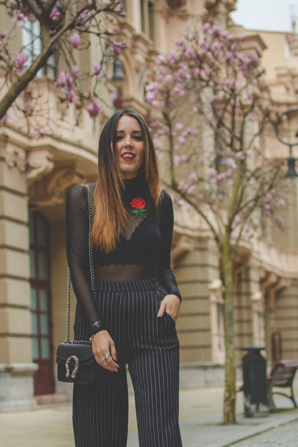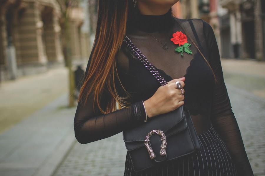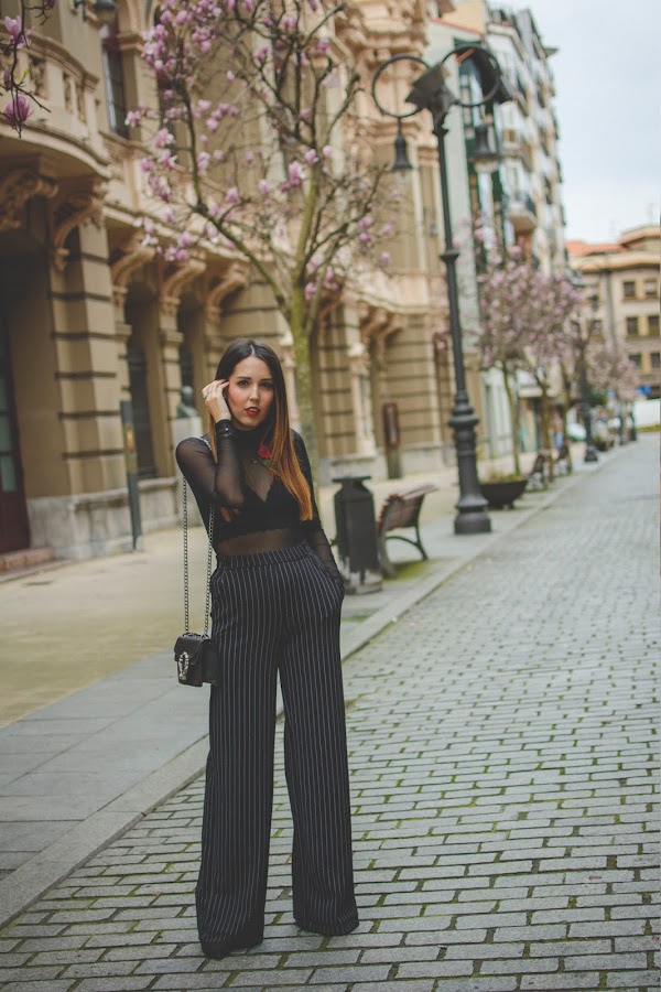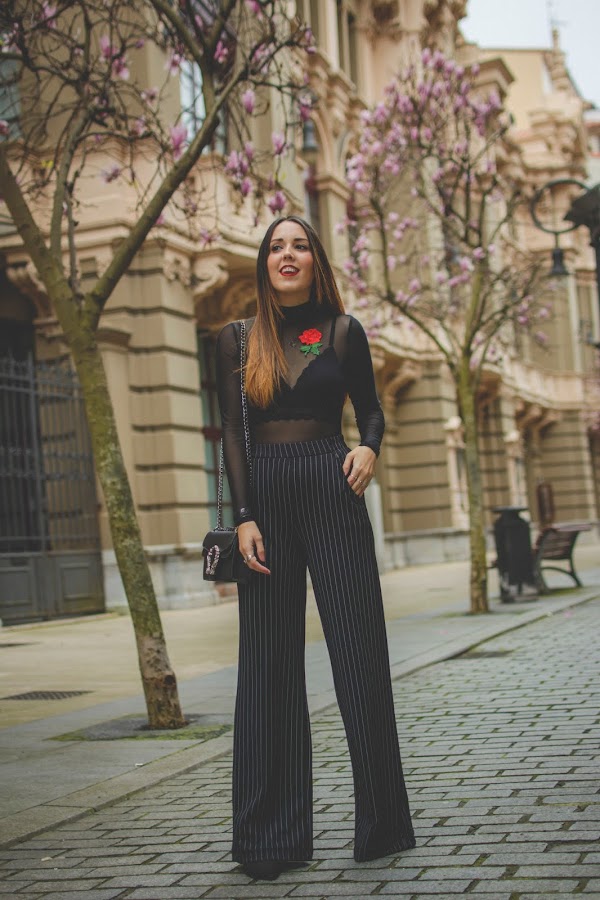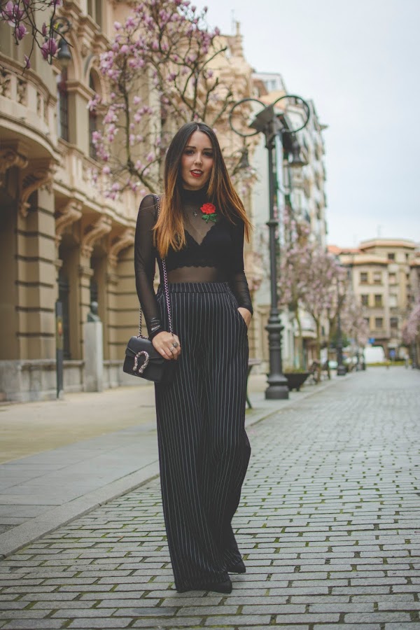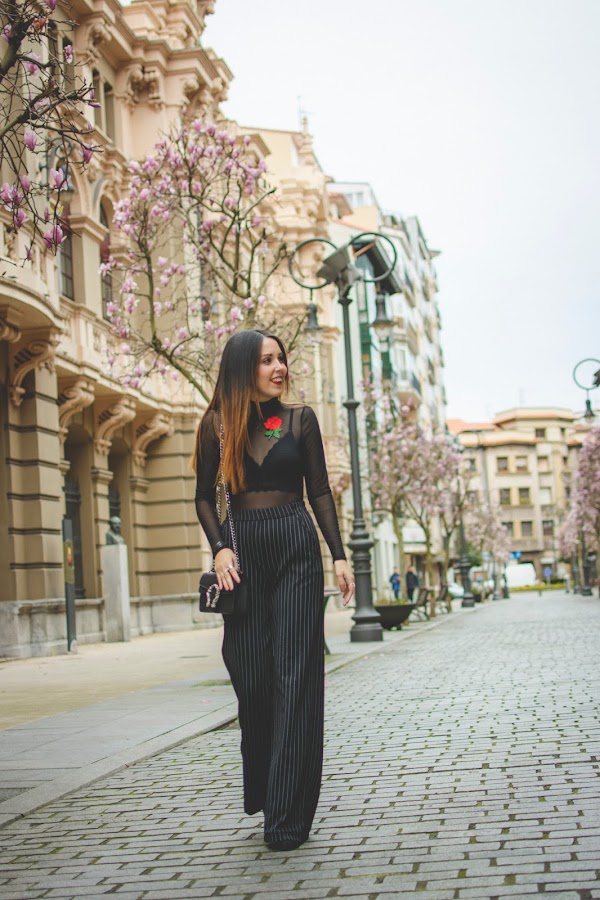 Para un evento así, quería algo elegante pero sin perder mi toque personal. Me decanté por el color negro y a partir de el, creé el look que hoy os enseño. Un pantalón palazzo con raya diplomática, aporta la parte más seria y elegante al look mientras que el body transparente, de cuello alto y con bordado de flor de Gamiss, le da el toque más actual. Para el interior, un precioso bralette en color negro que se deja ver a través de las transparencias. El bolsito imita al ya icónico modelo Dionysus de Gucci en su versión mini, también es de Gamiss. Aunque los botines no se vean, son de tacón alto y puntera para que estilice nuestro look.