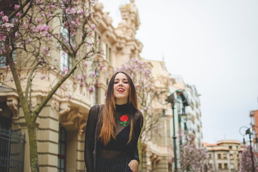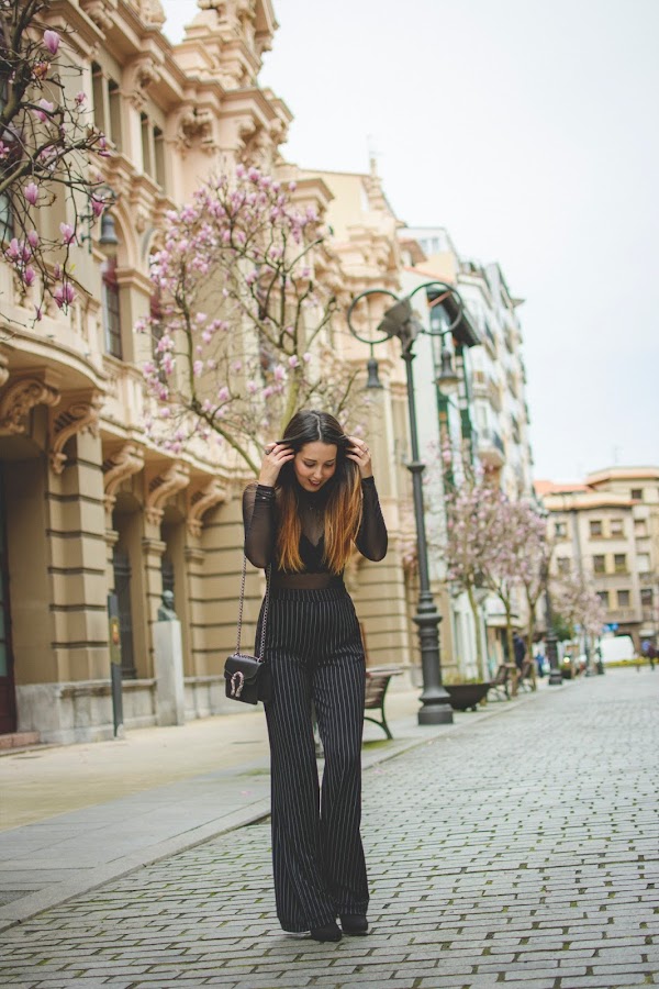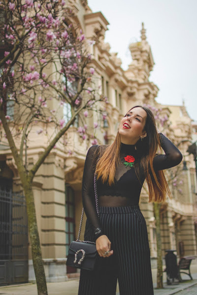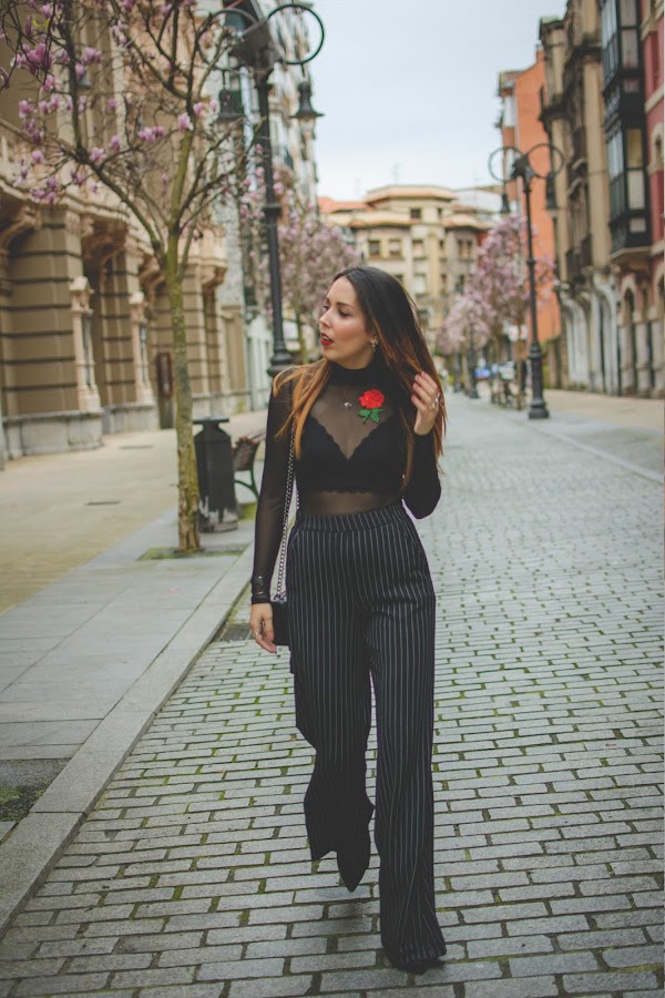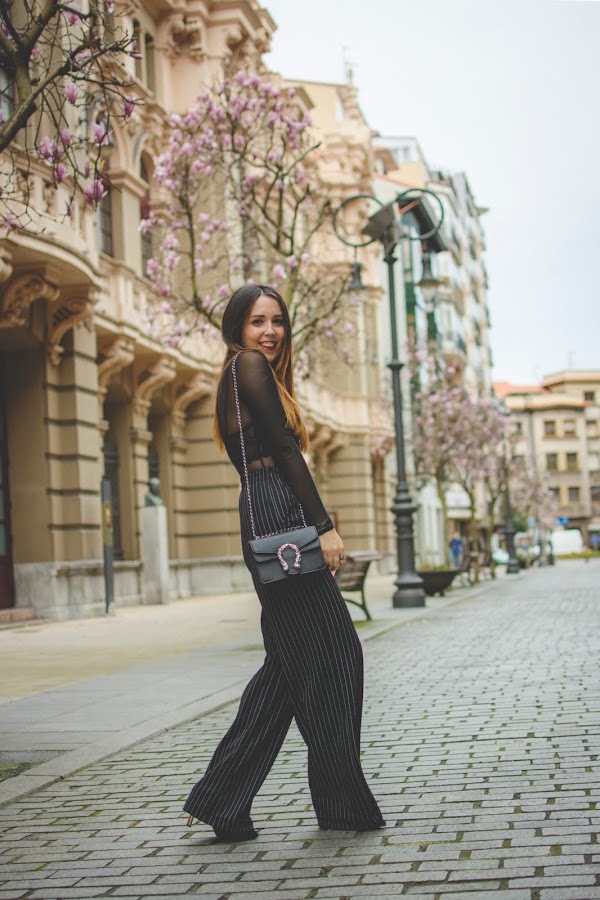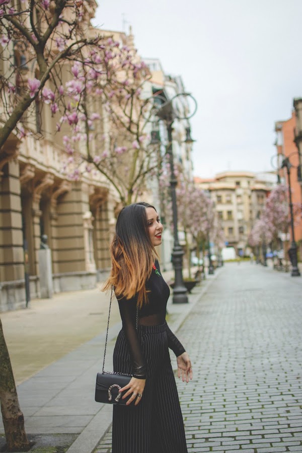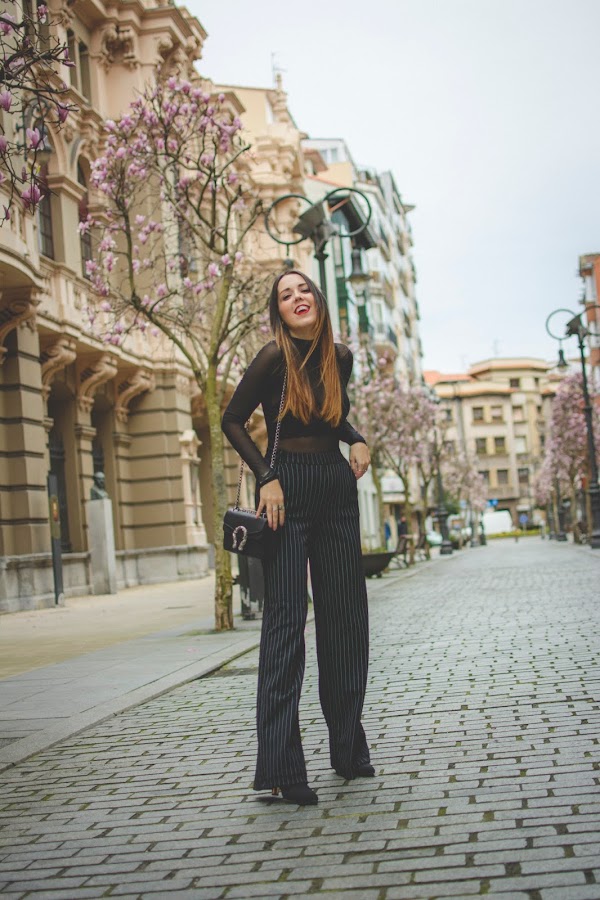 Para un evento así, quería algo elegante pero sin perder mi toque personal. Me decanté por el color negro y a partir de el, creé el look que hoy os enseño. Un pantalón palazzo con raya diplomática, aporta la parte más seria y elegante al look mientras que el body transparente, de cuello alto y con bordado de flor de Gamiss, le da el toque más actual. Para el interior, un precioso bralette en color negro que se deja ver a través de las transparencias. El bolsito imita al ya icónico modelo Dionysus de Gucci en su versión mini, también es de Gamiss. Aunque los botines no se vean, son de tacón alto y puntera para que estilice nuestro look.