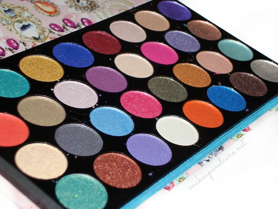 La paleta contiene un espejo en su interior , y 32 sombras de diferentes acabados pero ninguna mate. Algunas son metalizadas, otras con subtono cobrizo, con chispitas shimmer etc . Aunque no contiene ningún tono neutro me parece una paleta muy bonita para maquillajes festivos.