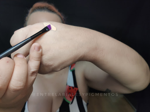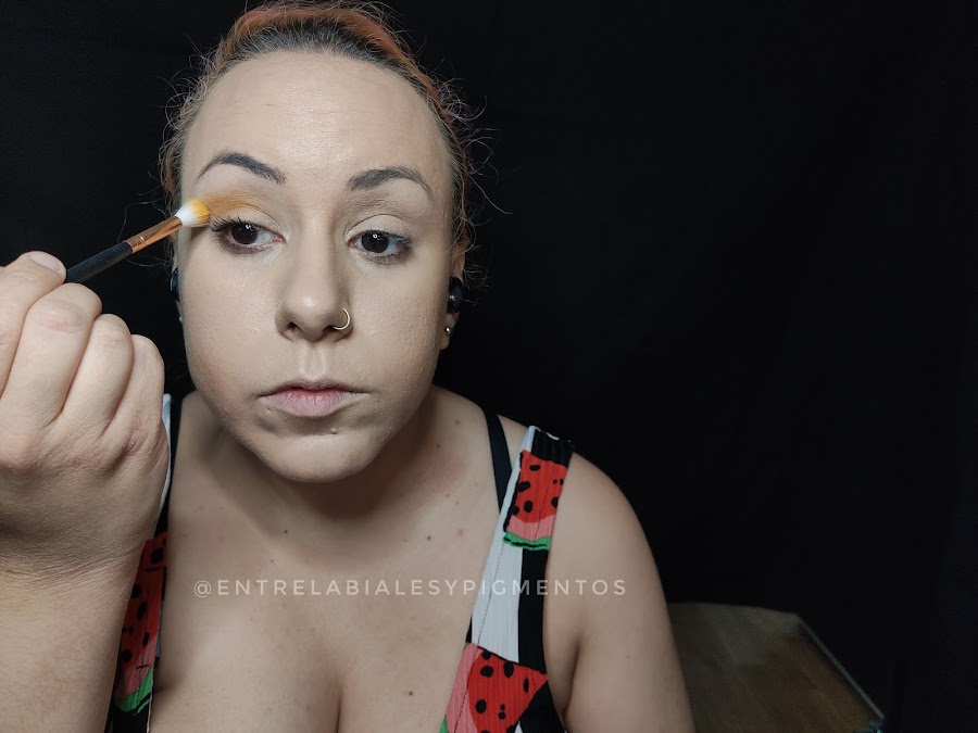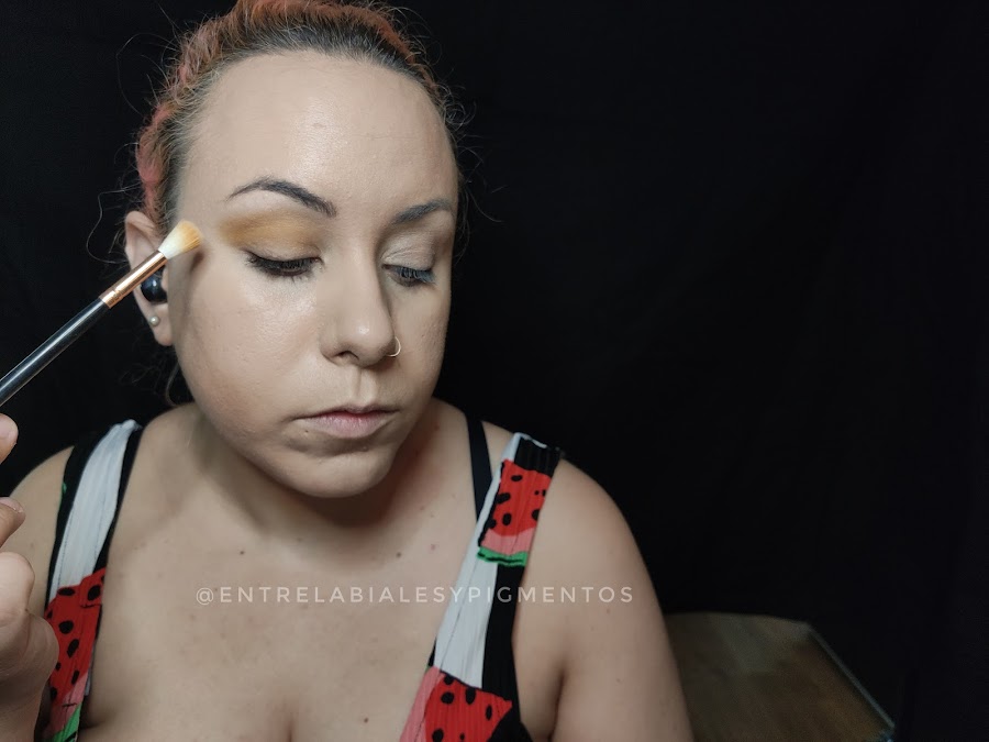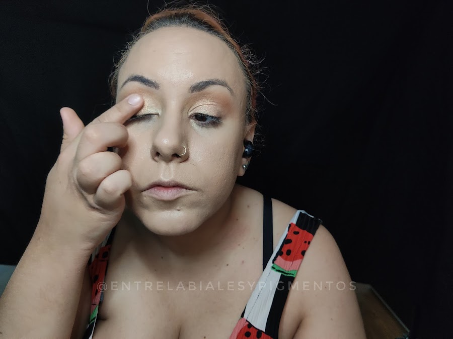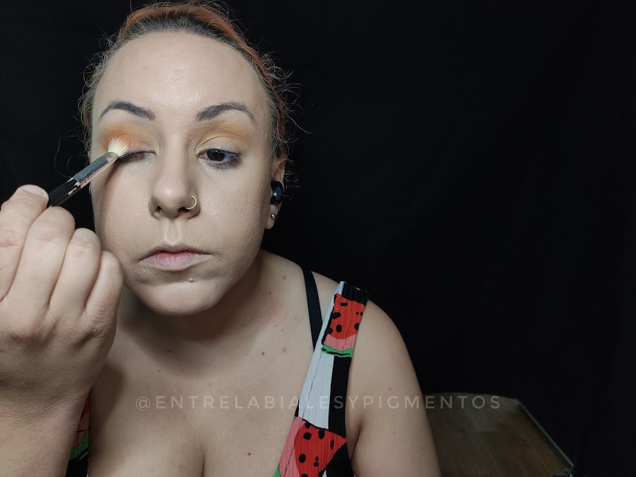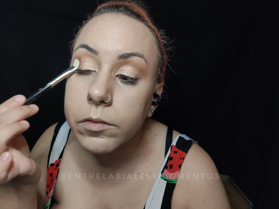 -Primero con la sombra "Sheashell" creamos una base con un pincel de difuminar sobre la cuenca del ojo.