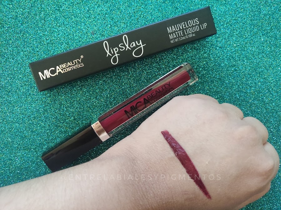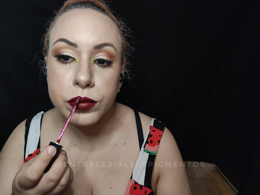 -Y para finalizar el makeup aplicamos labial, para eso he puesto a prueba el labial mate líquido "Lipslay" de Mica Beauty en el tono "Temptress". Es un tono borgoña oscuro que a pesar de calificarlo de color "otoñal" a mi me gusta usarlo durante todo el año y sobre todo en verano porque le aporta un toque sofisticado a los looks y hacen parecer que la piel está mas bronceada.