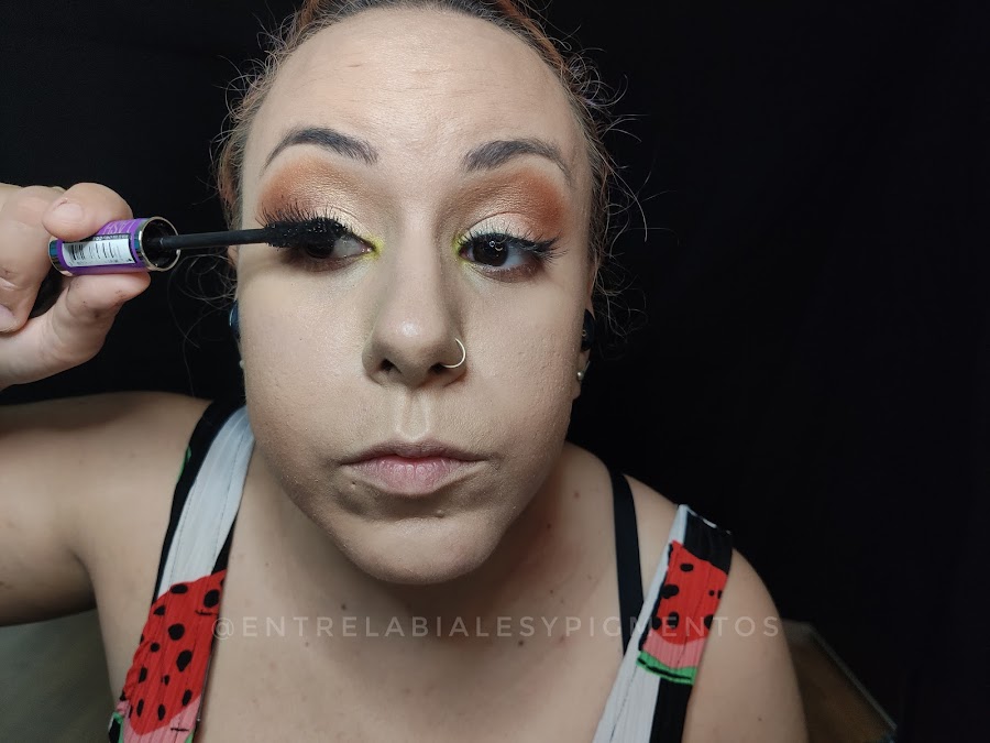 -Después aplicamos pestañas postizas(he usado unas que me regalaron de Pinky Paradise) y aplicamos máscara de pestañas "False Lashes" de Maybelline para que se mezclen con nuestras pestañas.