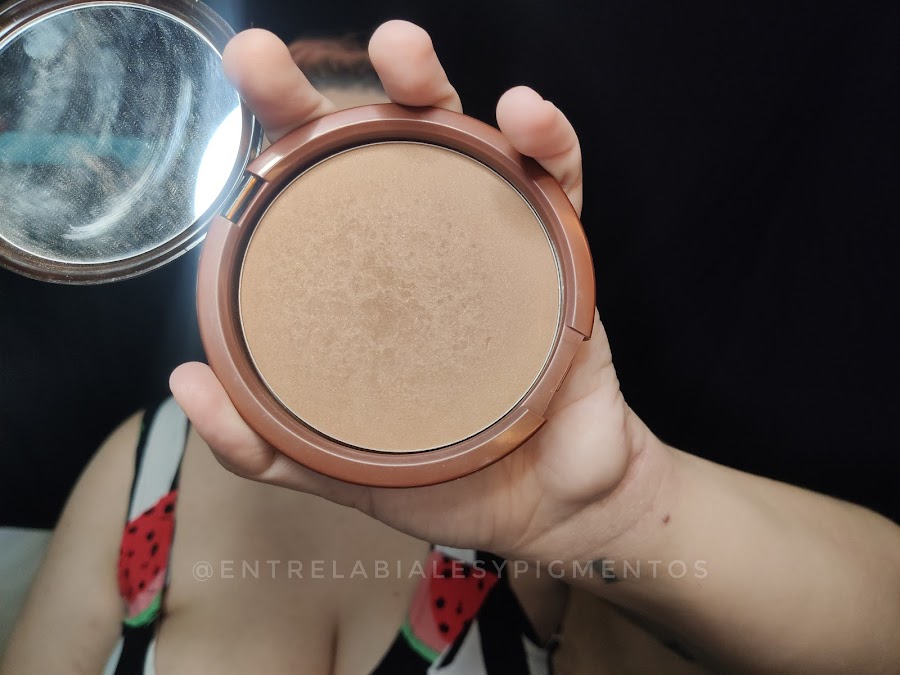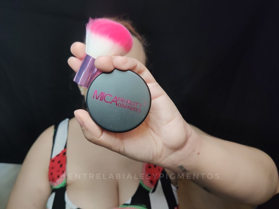 -Ahora vamos al rostro, para el colorete he usado este en formato polvo suelto de la marca "Mica Beauty" en un tono "Mocha Mist". Lo he usado con el kabuki de la misma marca aplanándolo con las manos y luego difuminando con el suelto.