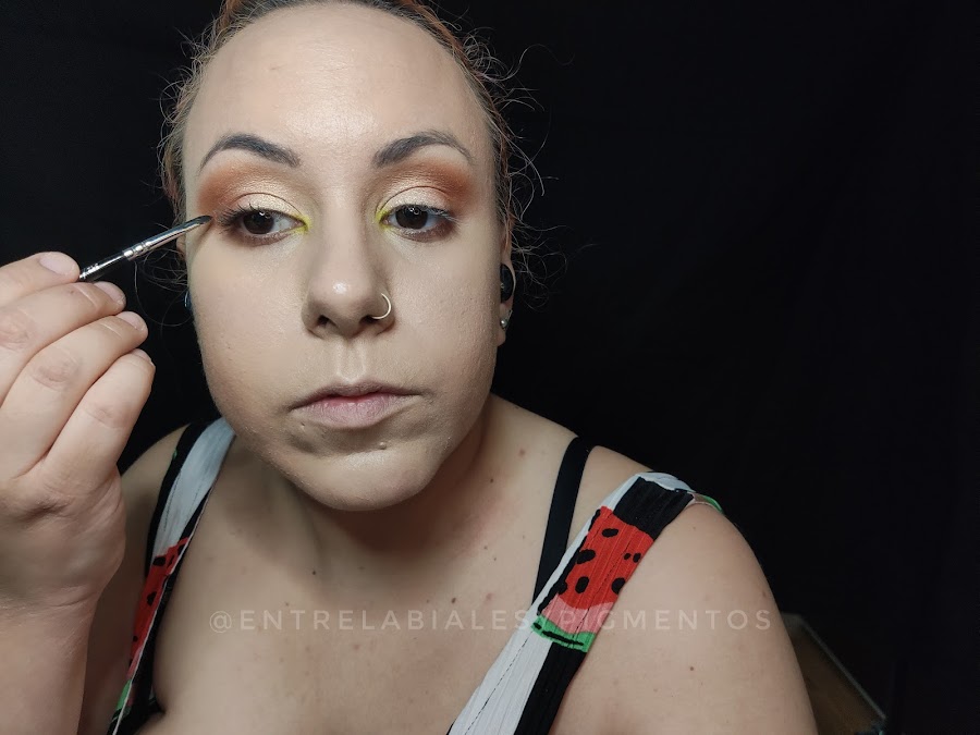 -Ahora para darle un toque de frescura a esos tonos tan cálidos aplicamos la sombra "Moray Eel" en el lagrimal, ese tono mate entre verde y mostaza tan bonito.