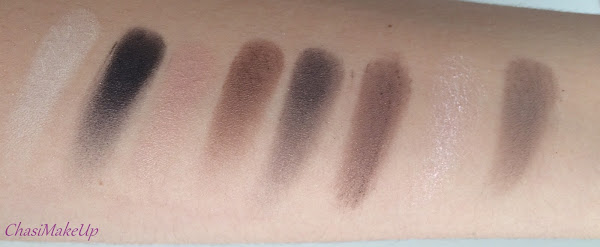 Y en la siguiente tanda de swatches me fallan dos, la quinta, no pigmenta apenas, pero se puede usar como transición, así la uso yo. Y la última que no se ve nada, pero para iluminar el arco de la ceja o dar un punto de luz al lagrimal va bien. Mi preferida es la cuarta, un tono marrón topo metalizado, precioso.