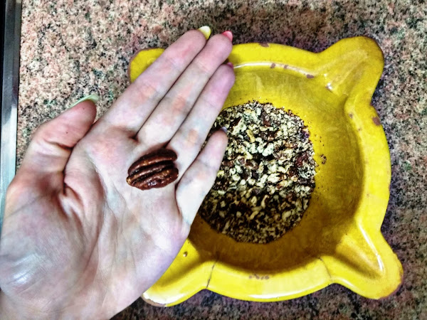 En un mortero ponemos la cantidad al gusto de nueces pecanas con miel y la picaremos, ni grande ni pequeña, que se vean trozos pequeños pero no en polvo. Reservamos.
