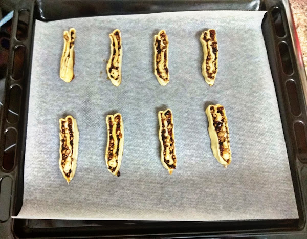 En la bandeja, ponemos papel de hornear y colocamos las palmeritas dejando una separación entre ellas para que abran.