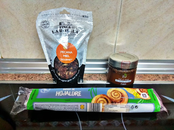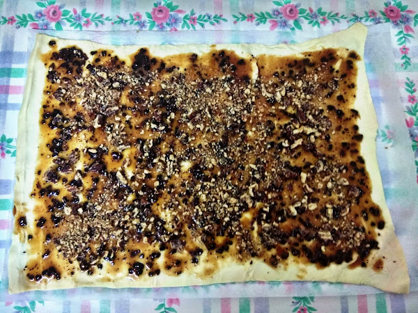 Añadimos las nueves pecanas con miel picadas por todo el hojaldre.