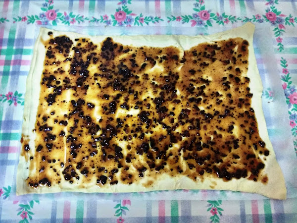 Con una cuchara extendemos la miel con pepitas de chocolate por todo el hojaldre.