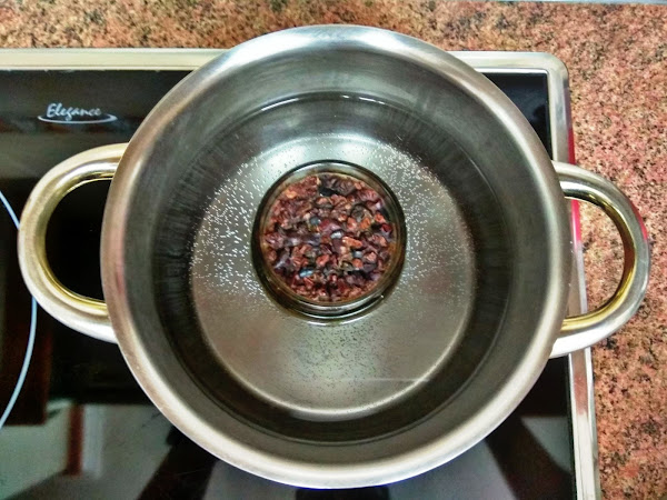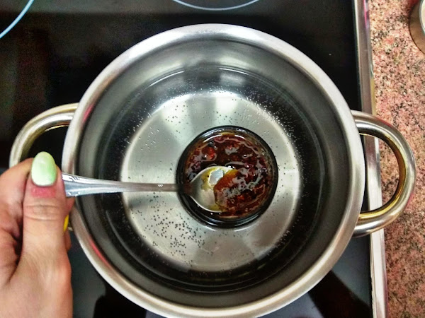 La miel con pepitas de cacao es muy densa por lo que la pondremos en un cazo al baño maria para que se nos derrita y sea más fácil poder untarla en la masa de hojaldre.