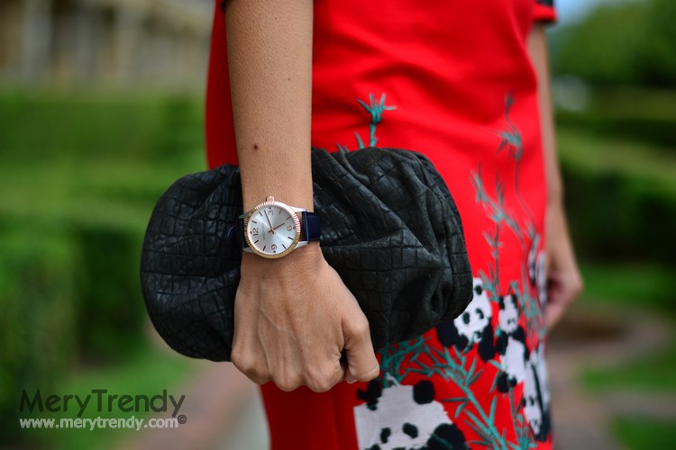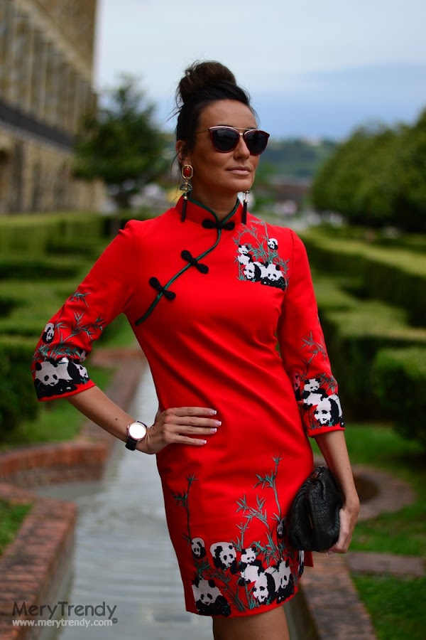 Hoy os enseño un vestido rojo de SammyDress, de corte oriental, con cuello mandarín y manga 3/4, que me encantó, no solo por su corte, sino también por su original estampado con bordado de pandas. Como complemento estrella, unos maxi pendientes geométricos, tan de moda esta temporada, que creo que casan a la perfección con el tipo de prenda. Respecto del peinado, un moño alto, para destacar el cuello y el pendientazo.