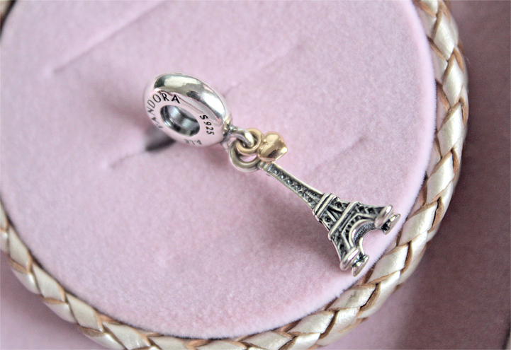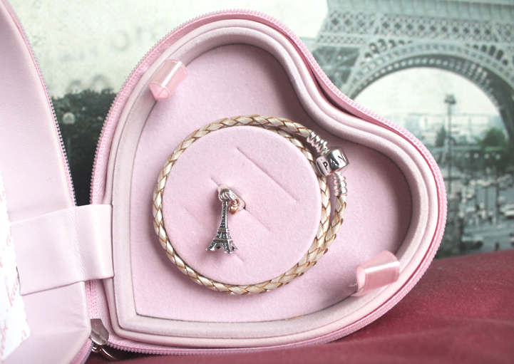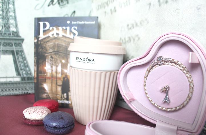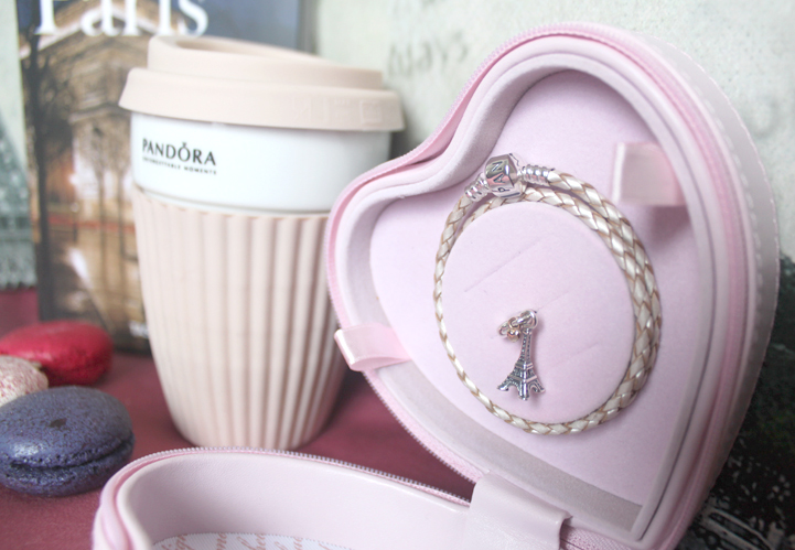 Hace poco llegó a casa una caja preciosa con motivos parisinos enviada por Pandora. Si bonita era por fuera mi sorpresa al abrirla fue aún mayor ya que contenía todo esto que veis arriba: una guía de París, un termo precioso en tono rosado, unos deliciosos macarons y una cajita en forma de corazón con una pulsera de cuero trenzado y cierre Pandora en plata, y un charm colgante Torre Eiffel con un pequeño corazoncito en Plata y Oro. Es precioso (en las fotos os lo enseño), al igual que la colección de San Valentín de Pandora de la que he quedado completamente enamorada ^_^