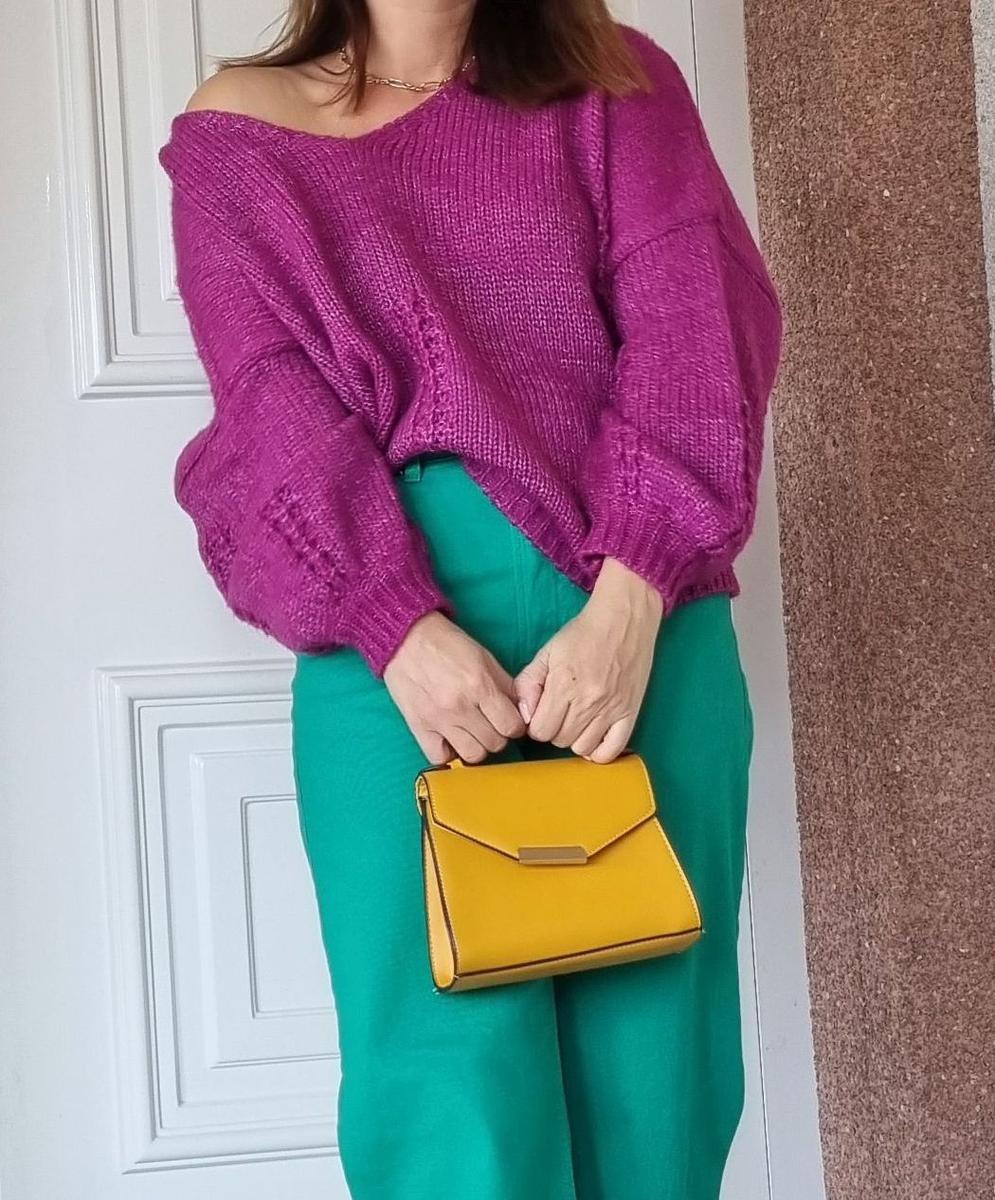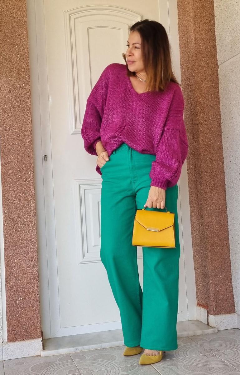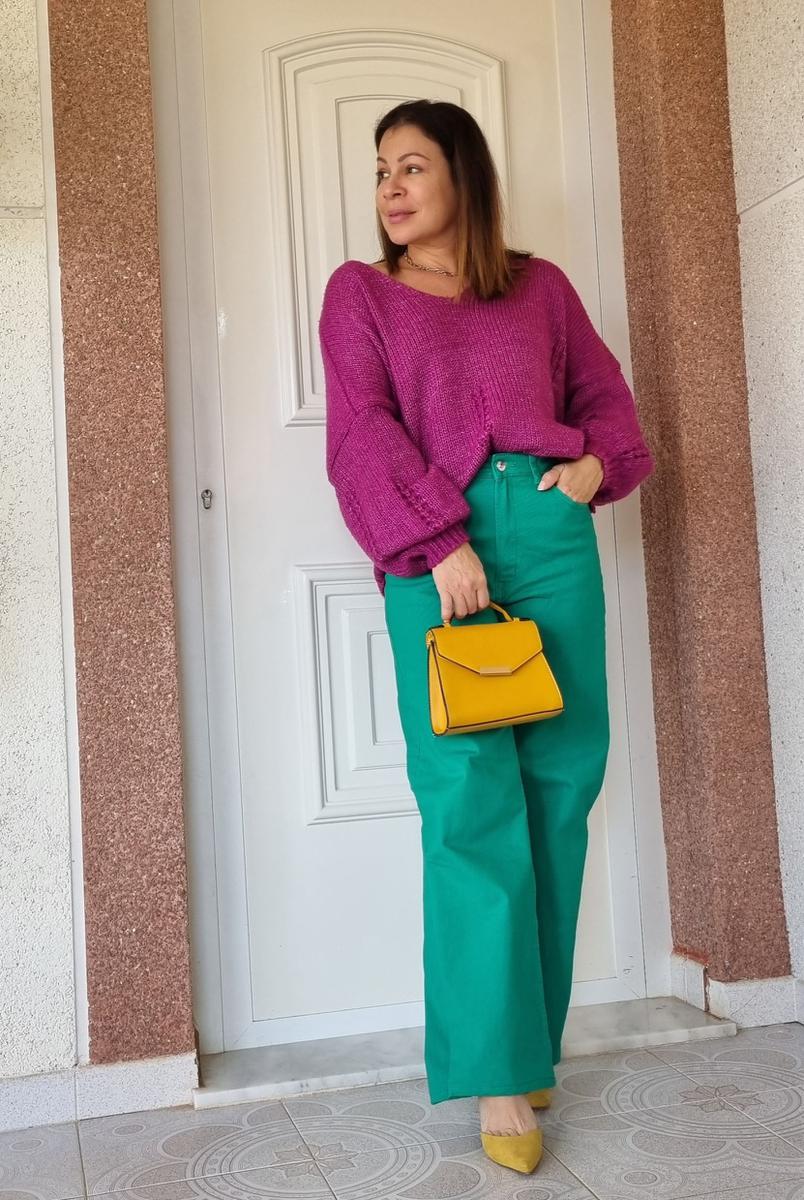 Sí hay una combinación más atrevida y alegre es esta. El verde combinado con amarillo y morado, hacen de un look además de alegre, perfecto para aquell@s que quieran y se atrevan a jugar con varios colores.