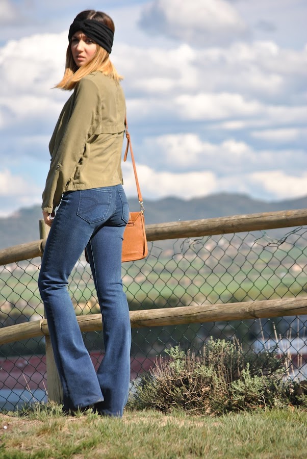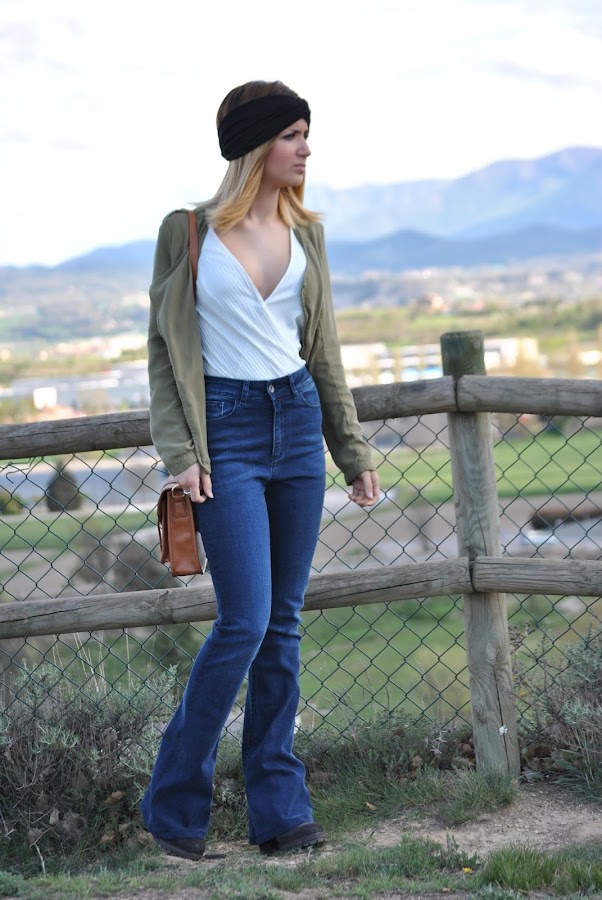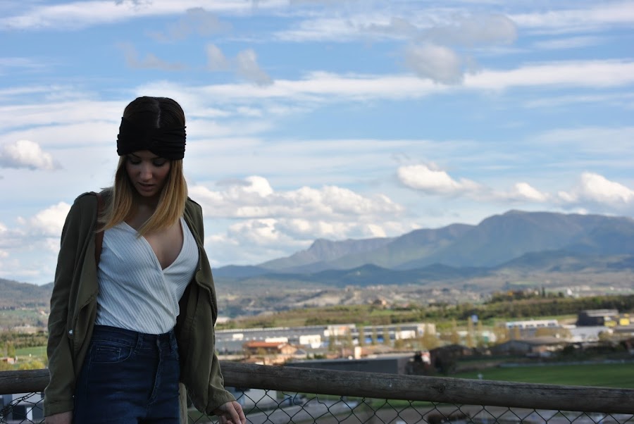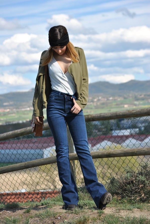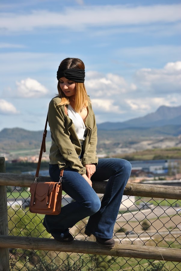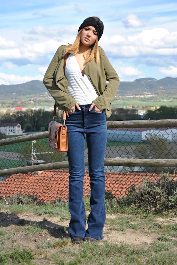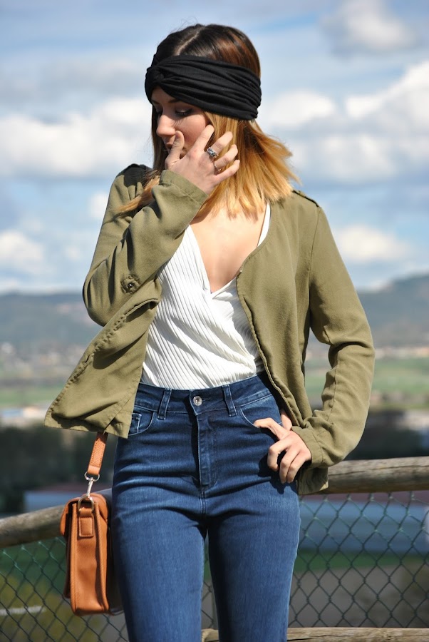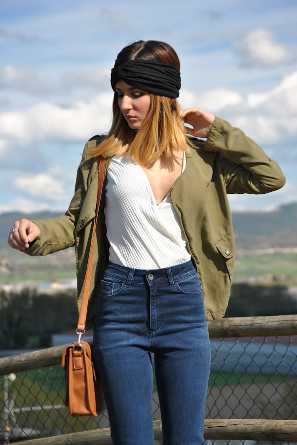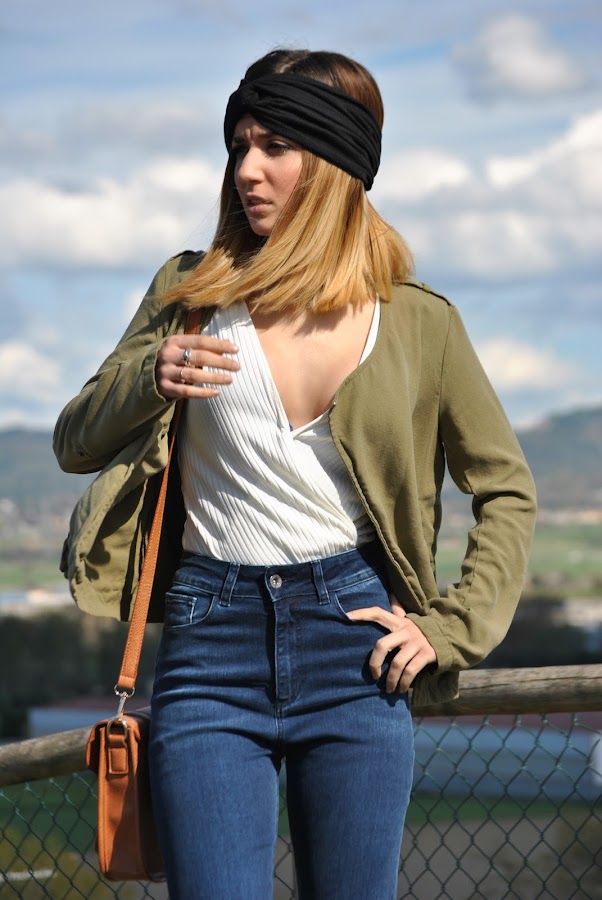 En éste caso, he combinado el jean con un body blanco escotado, chaqueta fina en verde militar, y para complementar, bolso satchel en camel y un turbante en negro.