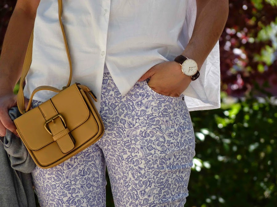 Como complementos estrené estas cuñas de color chocolate comodísimas de una tienda local de Donosti, un mini-bolso ideal también de Venca y la pieza estrella del look: el reloj Daniel Wellington, de esfera clásica en dorado y correa marrón chocolate. ¡Me tiene enamorada!