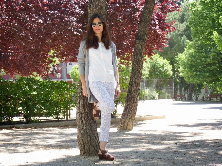 El otro día vi estos pantalones estampados en Venca y no me pude resistir. Me apetecía tener unos porque me parecen una buena opción para esta época del año casi veraniega. Además, son muy femeninos y coquetos, por lo que los combiné con una blusa con bordados en el cuello. Para estos días de frío calor, nada como maxi chaquetas de punto, perfectas para el quita y pon.