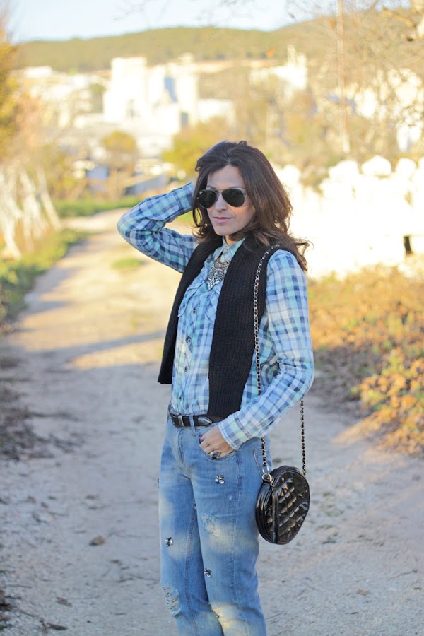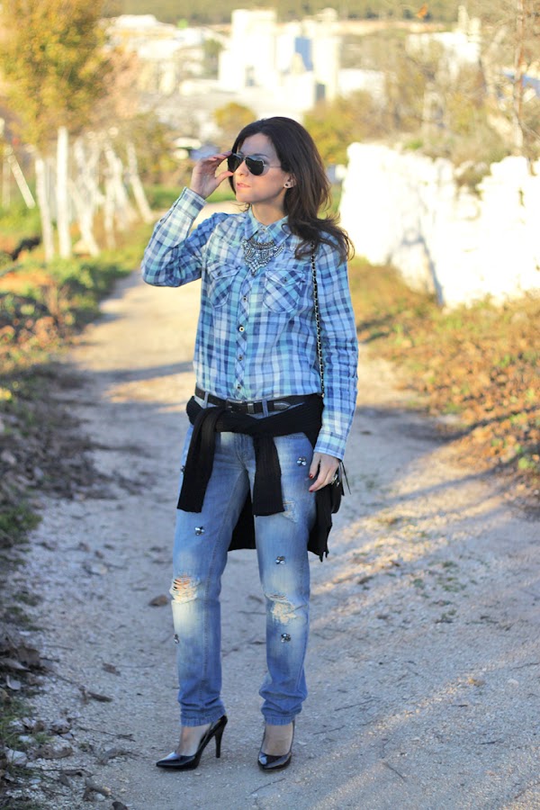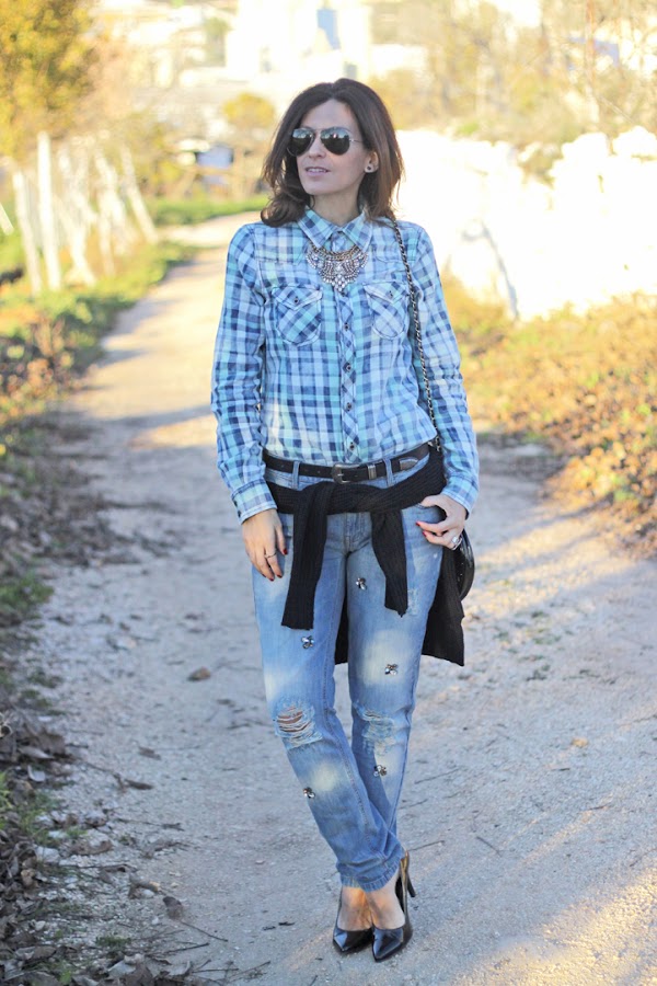 Desde que compré los primeros vaqueros rotos que ya vísteis aquí y aquí no paro de fijarme en todos los jeans con descosidos que veo en las tiendas. Estos son los segundos que tengo y en las rebajas han caído otros más. Además, desde que empezaron a llevarse no paran de verse en tiendas y editoriales de moda temporada tras temporada, será por eso que tengo tanta fijación por ellos. Los vaqueros que os enseño hoy llevan además unos bordados con piedrecitas que los hacen aún más especiales (otro look con ellos aquí). En cuanto al resto del look opté por camisa de cuadros, mi collar preferido y tacones, ¿Qué os parece? ¡Qué tengáis muy buen día!