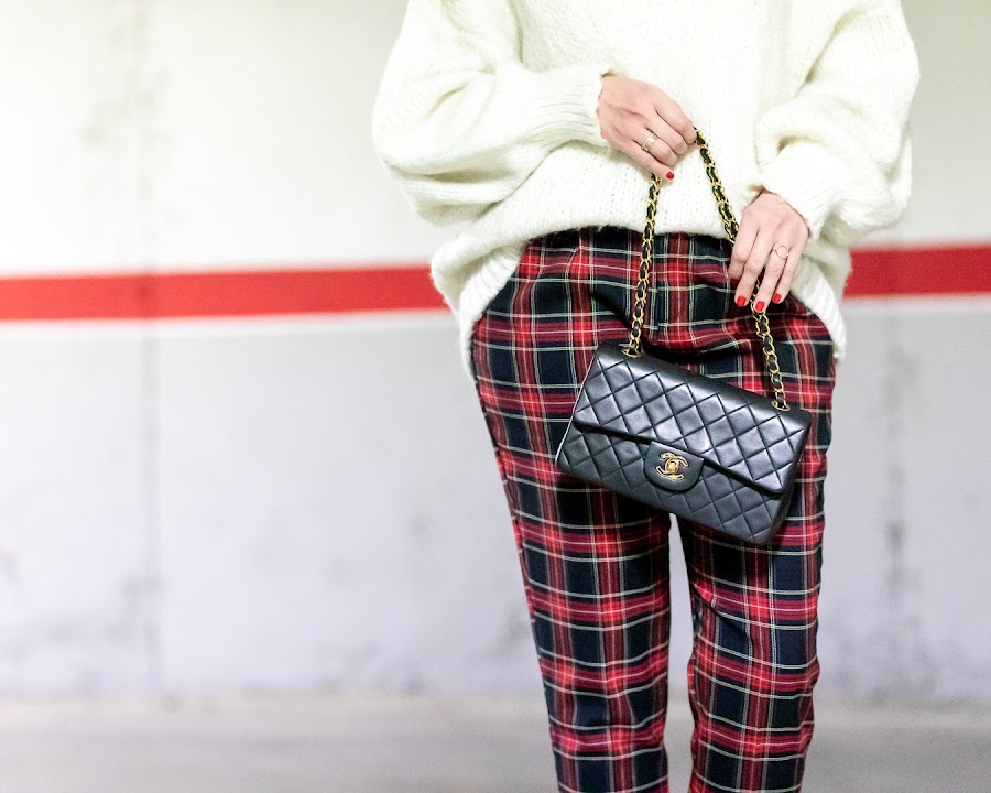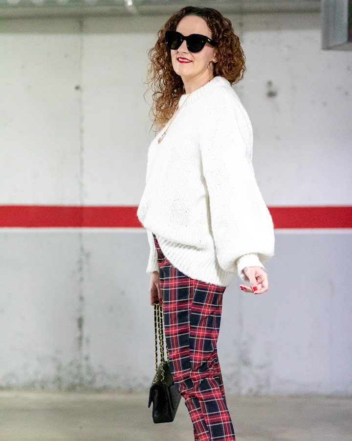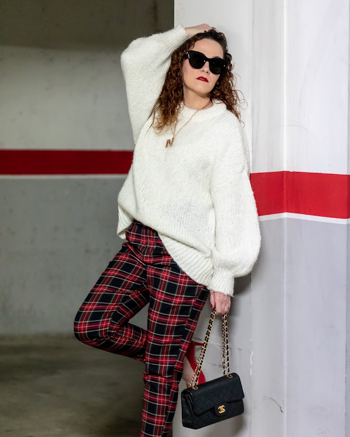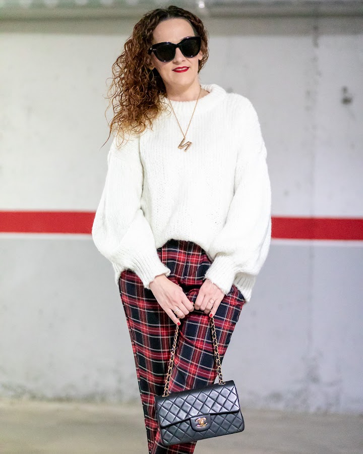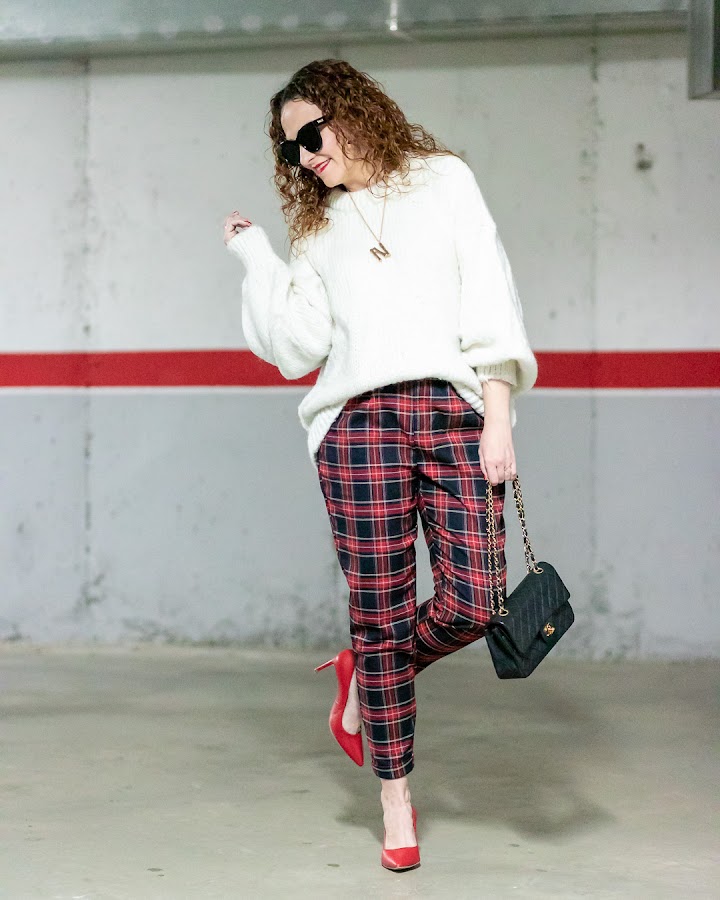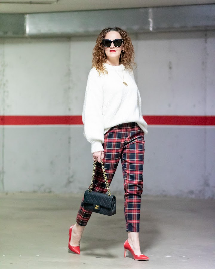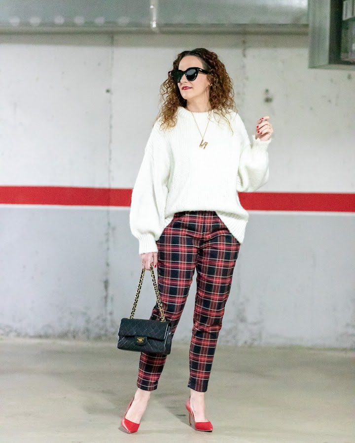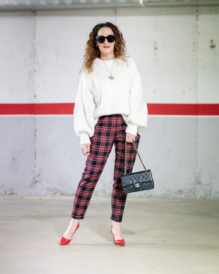 Hoy os enseño un look que llevé hace unos días para ir a la oficina. Un estilismo cómodo, ideal para aguantar toda la jornada laboral, y en el que los pantalones le dan el toque diferente con el tartan en negro y rojo.