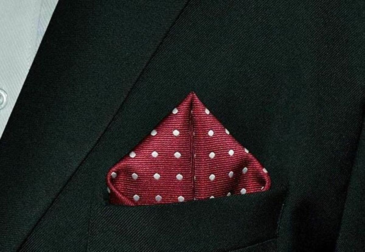 Otra elección esencial es un pañuelo de bolsillo burdeos con lunares. Los lunares adquirieron prominencia por primera vez en el siglo XIX y, aunque su popularidad ha aumentado y disminuido, se han convertido en pilares de la ropa masculina clásica para dar un toque de color a tu atuendo. Y debido a su patrón repetitivo simple, pero pequeño, los lunares nunca sobrecargarán tu look con demasiado interés visual.