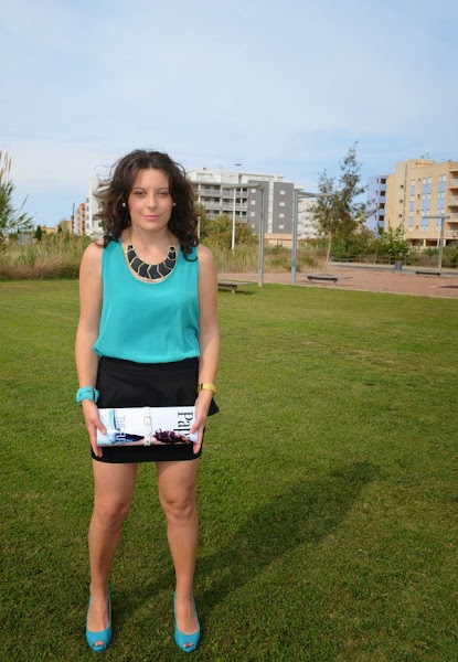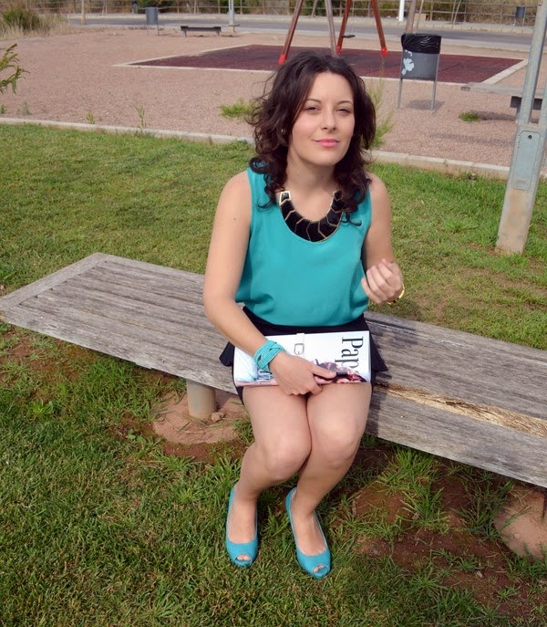 En esta ocasión me lo puse para salir un sábado. Como los colores del clutch son tonos grisáceos, turquesa suave y negro, quise mantener la armonía en todo el outfit y elegí esos mismos tonos para la ropa. La falda que llevo es de estilo péplum, este año ha pasado más desapercibida, pero es un estilo que me parece muy femenino y además estiliza un montón. La camiseta es una básica color turquesa de Stradivarius, este verano las habréis visto en infinidad de colores. Y como no, mis adorados peep toes. Ya os he dicho un montón de veces que estos zapatos son comodísimos! Los puedo llevar toda la noche y es como andar descalza.