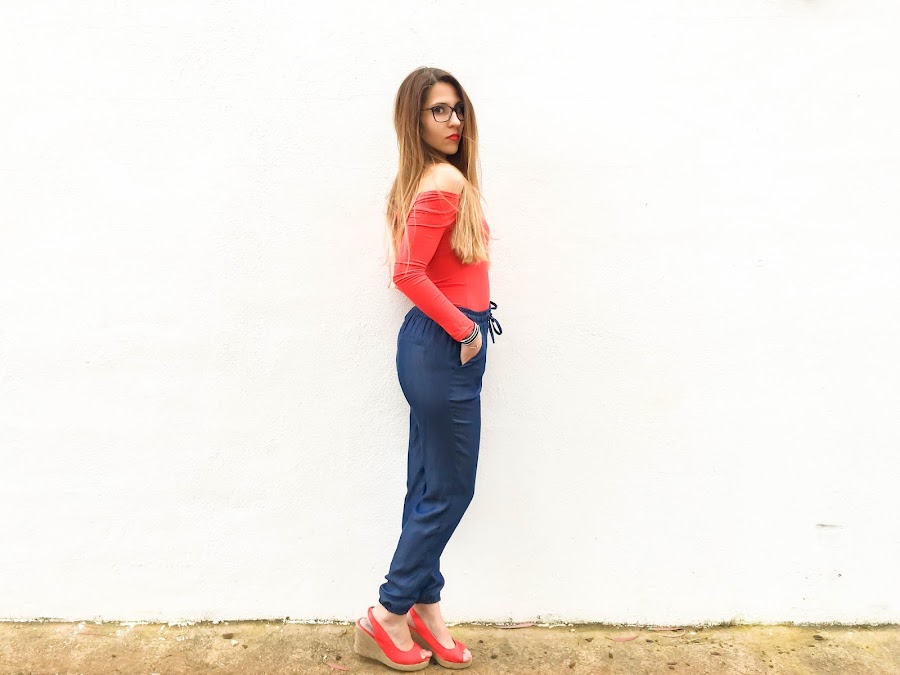 Lo he combinado con una camiseta roja de hombros descubiertos y unas cuñas de esparto del mismo color!