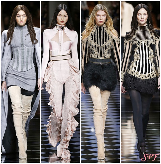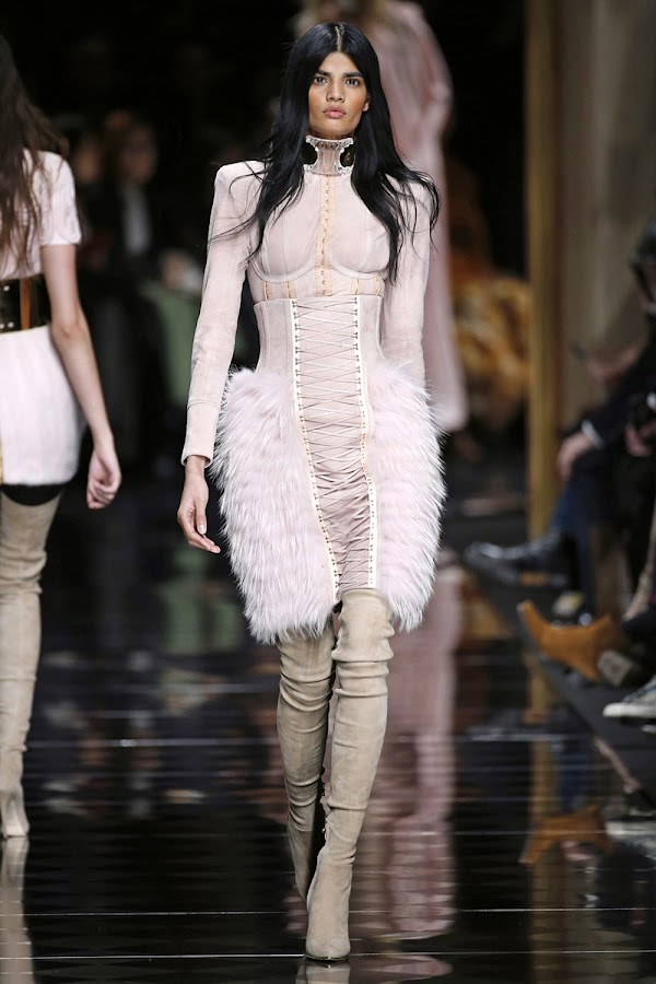 La colección de Balmain creada por Olivier Rousteing ha despertado furor y es que todo lo que rodea a este joven diseñador parece de máximo interés. La paleta de colores se suaviza, teniendo en cuenta los tonos chillones de anteriores colecciones, pasando a tonos más suaves (podemos ver el rosa cuarzo de este 2016), aunque continúa su línea de cinturas marcadas, trajes encorsetados y tejidos con bordados y brocados que tantas adeptas tiene.