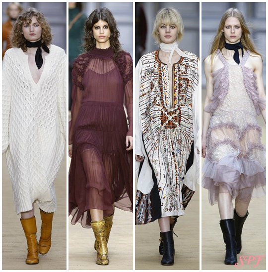 Chloé sigue fiel a su estilo hippie chic, con inspiración en los años 70, la colección representa a una mujer nómada, que viaja de un lugar a otro y se viste con ropas cómodas y amplias, en algunos casos, como ponchos y túnicas; y vestidos delicados y femeninos en otros.