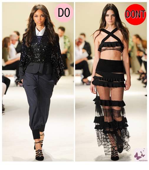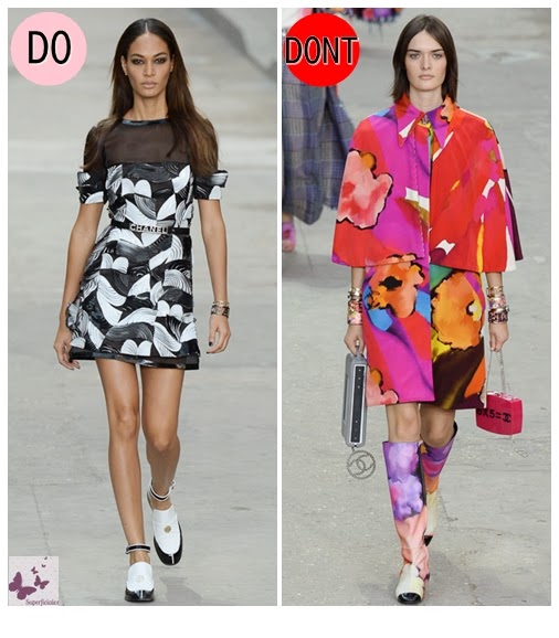 El desfile de Chanel ha sido espectacular, pero eso no quiere decir que nos tenga que gustar toda su colección. El vestido blanco y negro me parece absolutamente ideal, en cambio la gabardina de la derecha me recuerda sospechosamente al payaso del anuncio de un famoso detergente...