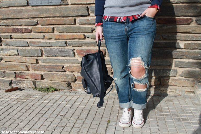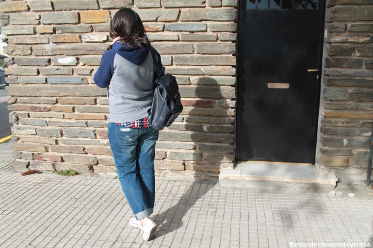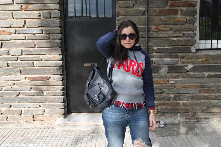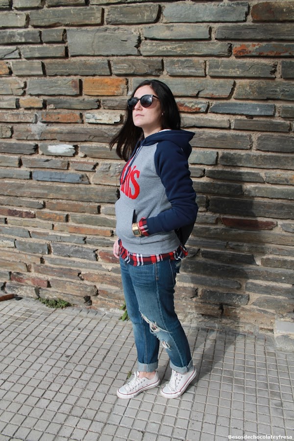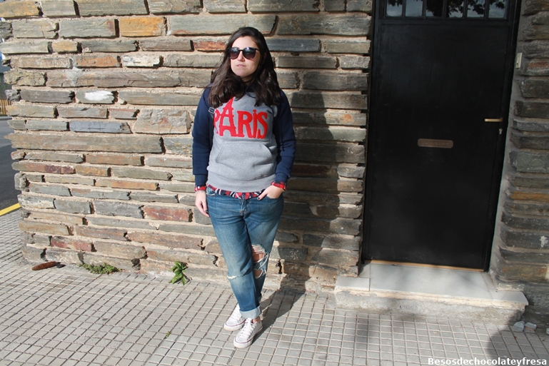 Today I bring a new look, with my new sweatshirt Paris, klein blue, gray and letters and icon of the Eiffel Tower in red, super warm, it has as stuffed inside and took the opportunity to release due to the cold of these days, full of fog, auque for photos seize the moment the sun came :) I carry with boyfriend jeans, a red shirt and blue tartan, converse and also in blue backpack.