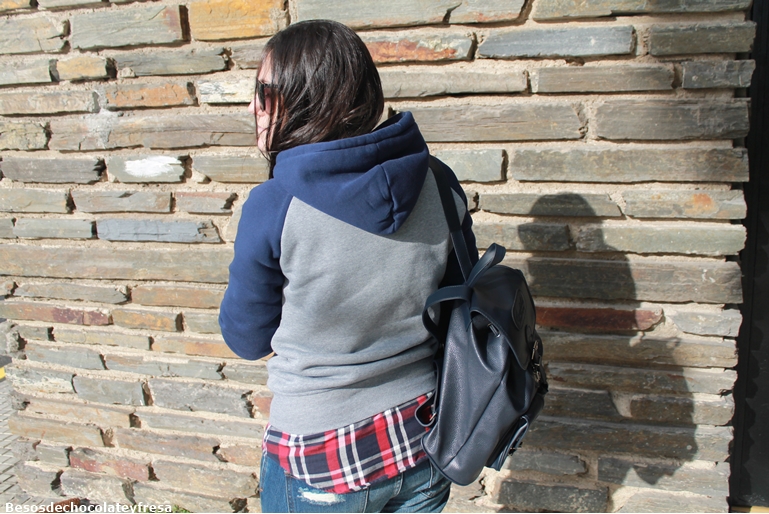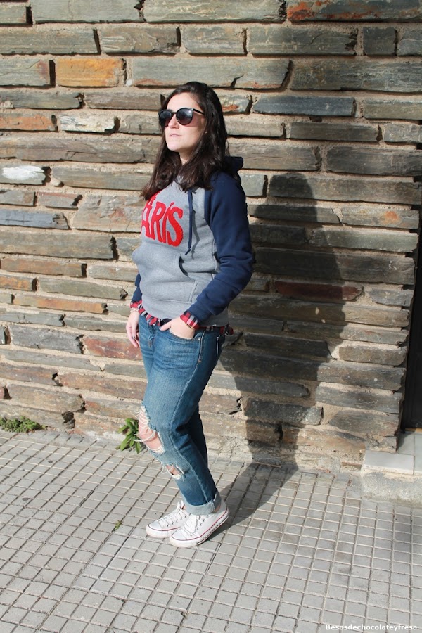 Hoy os traigo un nuevo look, con mi nueva sudadera de Paris, en azul klein, gris y letras e icono de la Torre Eiffel en rojo, super calentita, pues tiene como peluche en el interior y que aproveché para estrenar debido al frío de estos dias, llenos de niebla, auque para las fotos aprovechamos el instante que salió el sol :) La llevo con boyfriend jeans, camisa tartan roja y azul, converse y mochila también en azul.