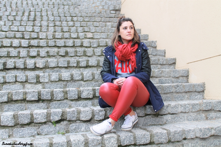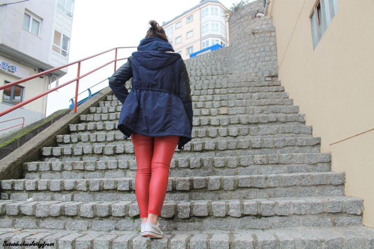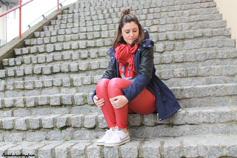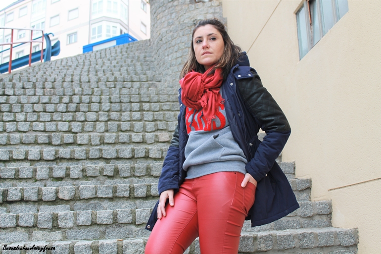 Rojo granate y azul combinado con gris son los colores protagonistas, donde el máximo color esta en los pantalones de tejido encerado y que me resultan muy cómodos y abrigosos para esos días. Sneakers y parka en azul con borreguillo junto con la de la sudadera completan el look.