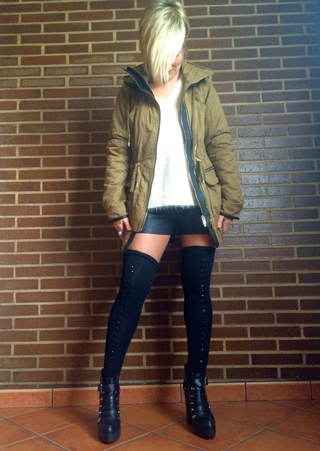 Esta parka me la compré al principio del otoño en Berska, me gustó por los remates el piel y el forro de borreguito. Los calcetines al muslo es una tendencia que, para las que nos gustan los shorts en invierno, nos viene muy bien porque abrigan. Los que llevo son de Calzedonia, adornados con tachas metálicas.