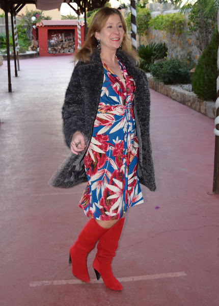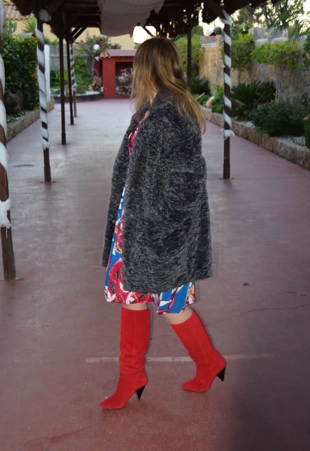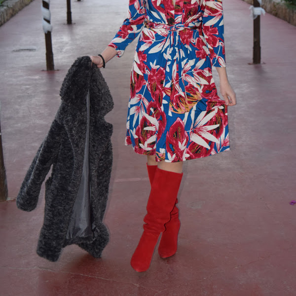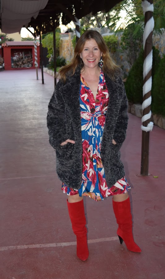 Algo sencillo, un vestido lleno de colores navideños, botas altas rojas y abrigo de pelo, que ha salido por aquí durante toda esta semana.