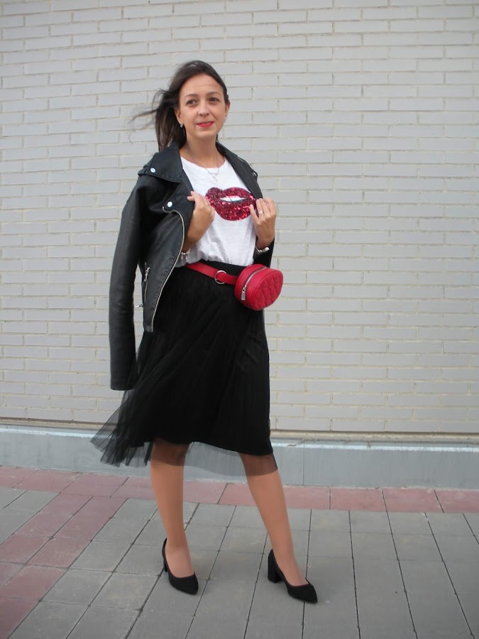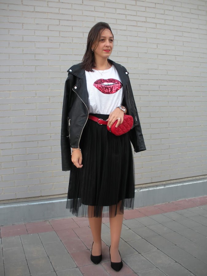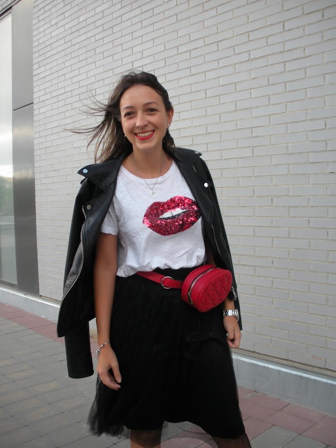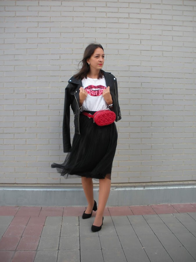Opté por falda midi de tul combinada con camiseta blanca con dibujo, biker y zapatos de tacón. El toque diferente lo daba la riñonera roja de Stradivarius que podéis encontrar todavía en tienda.