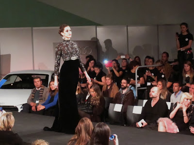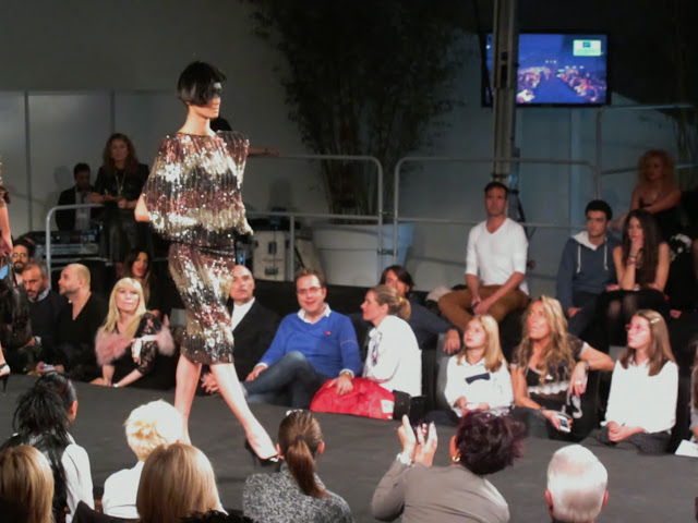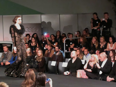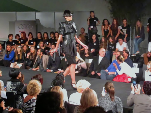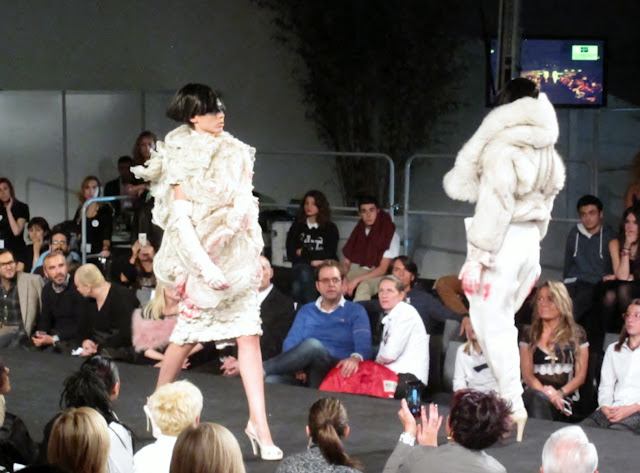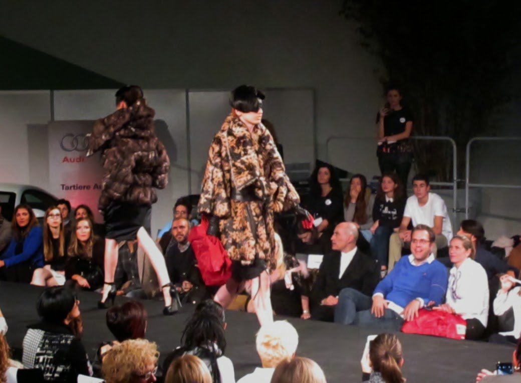 Comenzó la pasarela a ritmo vestiginoso, las modelos apenas se detenían a posar para los fotógrafos, sonaba música de Michael Jackson, las modelos llevaban un elaborado maquillaje basado en una franja negra que cubría la parte de los ojos y peluca que le tapaba un ojo, exhibieron algunas de las piezas más aplaudidas de las diferentes colecciones del modista. Vinilo, cuero, pieles abrigos oversize, trajes de chaqueta, bombachos, con una cromática que osciló del negro al blanco pasando por gris, rojo y camel fue lo que pudimos ver.