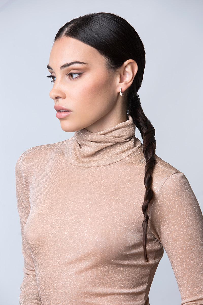 Sujétala con una goma fina y con un mechoncito pequeño de la coleta, rodea la goma para que no se vea. Sujeta con una horquilla o metiendo la punta del mechoncito entre la goma.