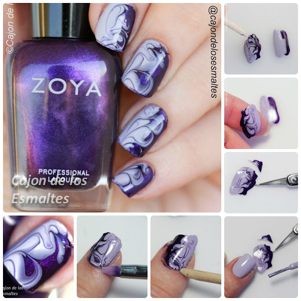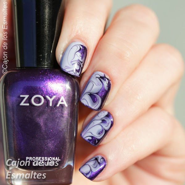 El efecto final en este caso me recuerda mucho a las ágatas. Los esmaltes que usé son un creme lila de Essie (Lilacism) y un violeta despampanante al sol de Zoya (Belinda).
