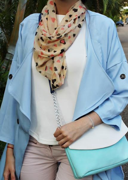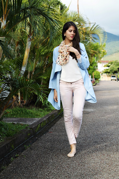 Mi combinación favorita del momento: el color azul bebe con el rosa pálido, enserio que me parece demasiado linda esta mezcla de colores. Decidí usar mi abrigo de Romwe con mi camisa blanca NIPA de la misma página, mis pantalones del momento estos Zara, mi nuevo hermoso bolso MIT BAGS -Talento Nacional- una bufanda que me regalo mi querida @Tiposofia (en instagram) y complementar con detalles muy minimalistas: flats nude y la hermosura de zarcillos Ananá Accesorios disponibles en @Lujo_accesorios