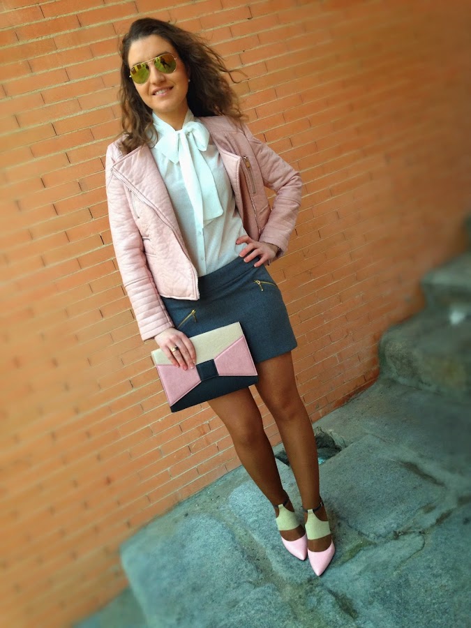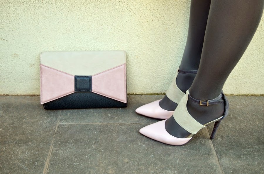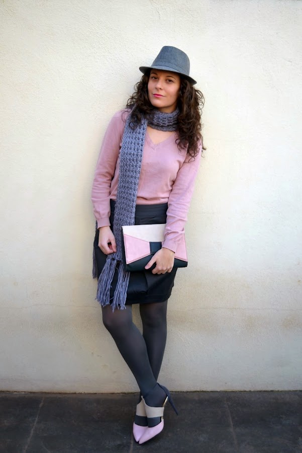 Por fin es viernes! Qué ganas tenía de que llegara este día, esta semana ha sido muy intensa y larga, he tenido mucho trabajo y ya habéis visto que no he podido actualizar todos los días. Hoy vengo con otro look y os enseño más cositas que me compré en rebajas y que ya os mostré en su día aquí y aquí . Se trata de este conjunto de zapatos y bolso en tonos pastel, concretamente en rosado, beige y gris. Me parece una combinación de colores muy dulce y práctica para looks de invierno como de primavera. En este caso yo opté por seguir en la linea de los colores del look. Llevo falda gris de estilo globo en la parte delantera y jersey de punto en rosa. Como sigue haciendo fresco cogí mi maxibufamda de lana gris y el borsalino. También os quiero mostrar otro outfit diferente con estos complementos. Podéis ver la propuesta de Teresa al final del post y no os olvidéis de pasar por su blog "Lo que sale de mi armario" para ver el look al detalle.
