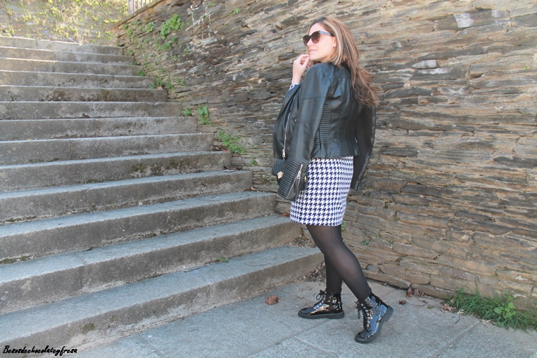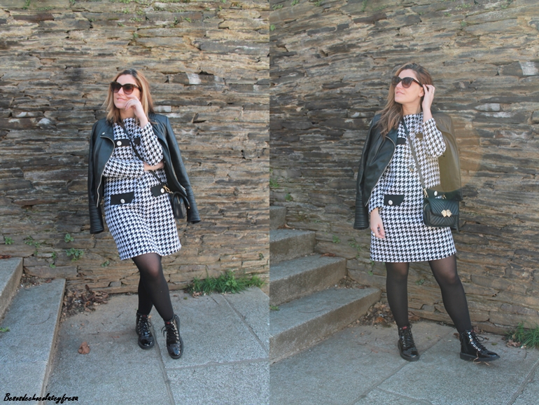 Como complementos opté por darle un toque cañero y desenfadado al vestido con chupa de cuero en negro y botas militares. Más complementos en negro como son el collar, bolso y medias.