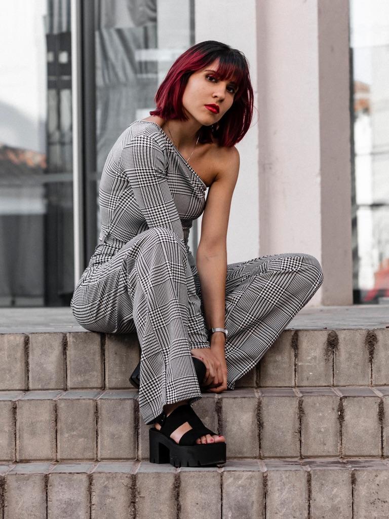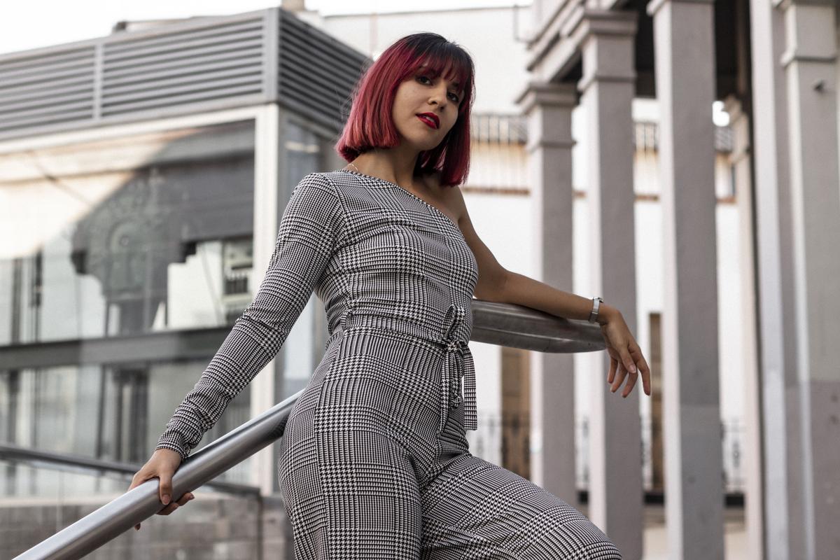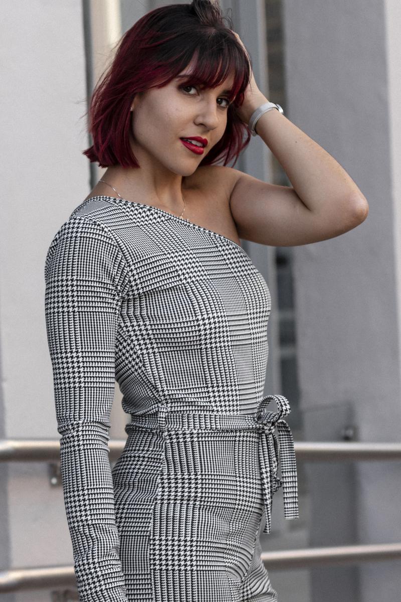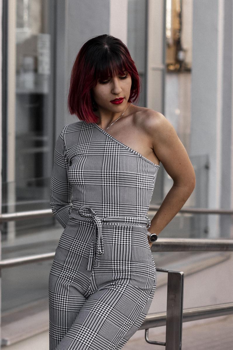 Es un mono de FEMME LUXE de estampado de pata de gallo. Me encanta como queda, como un guante. Además, me encantan las escotes asimétricos, con una manga larga y el otro lado sin manga. Trae un cinturón de la misma tela que puedes anudar delante o detrás!